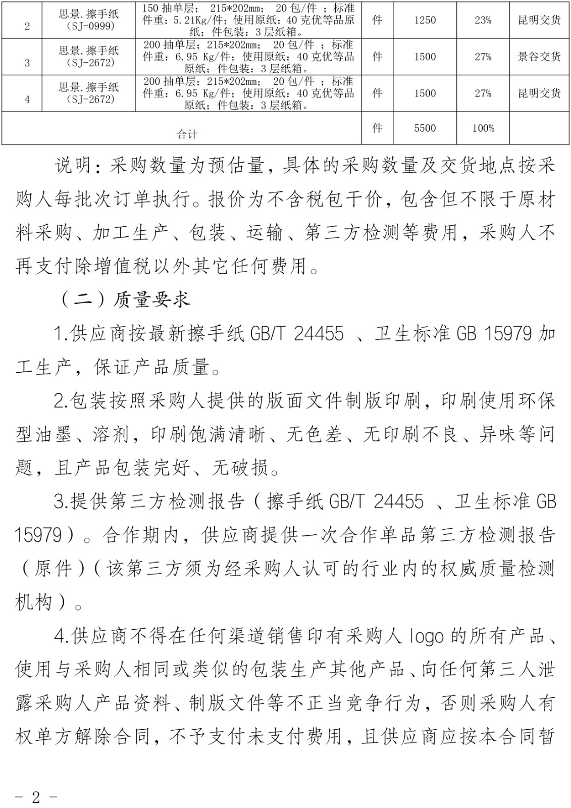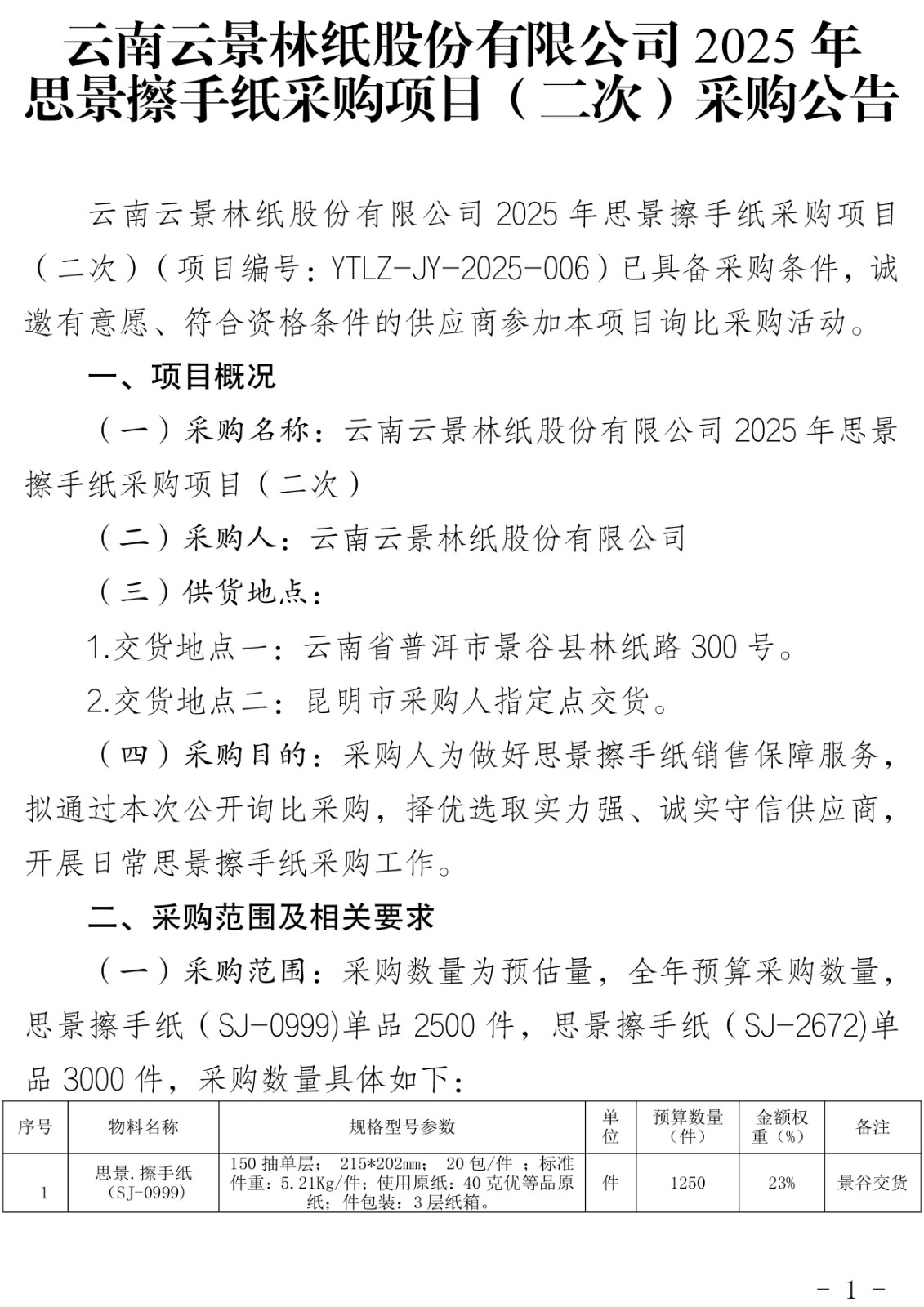 云南云景林紙股份有限公司2025年思景擦手紙采購(gòu)項(xiàng)目(二次)采購(gòu)公告