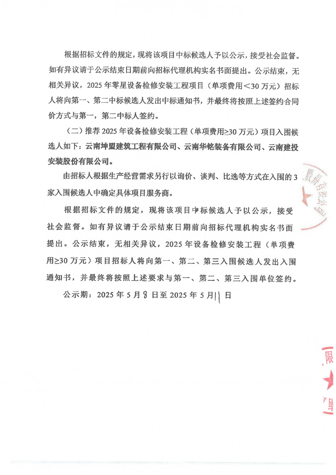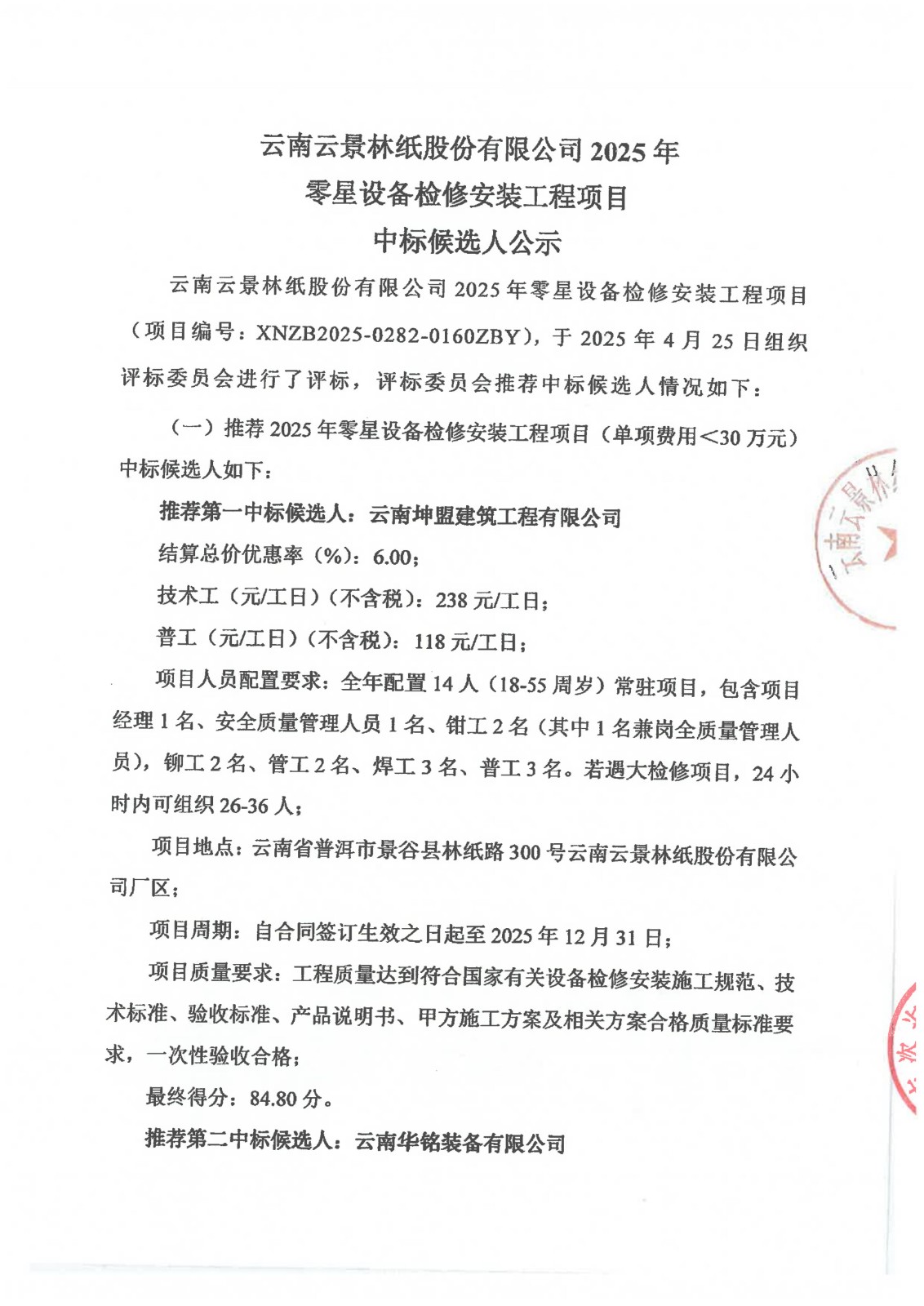 云南云景林紙股份有限公司2025年零星設(shè)備檢修安裝工程項(xiàng)目中標(biāo)候選人公示
