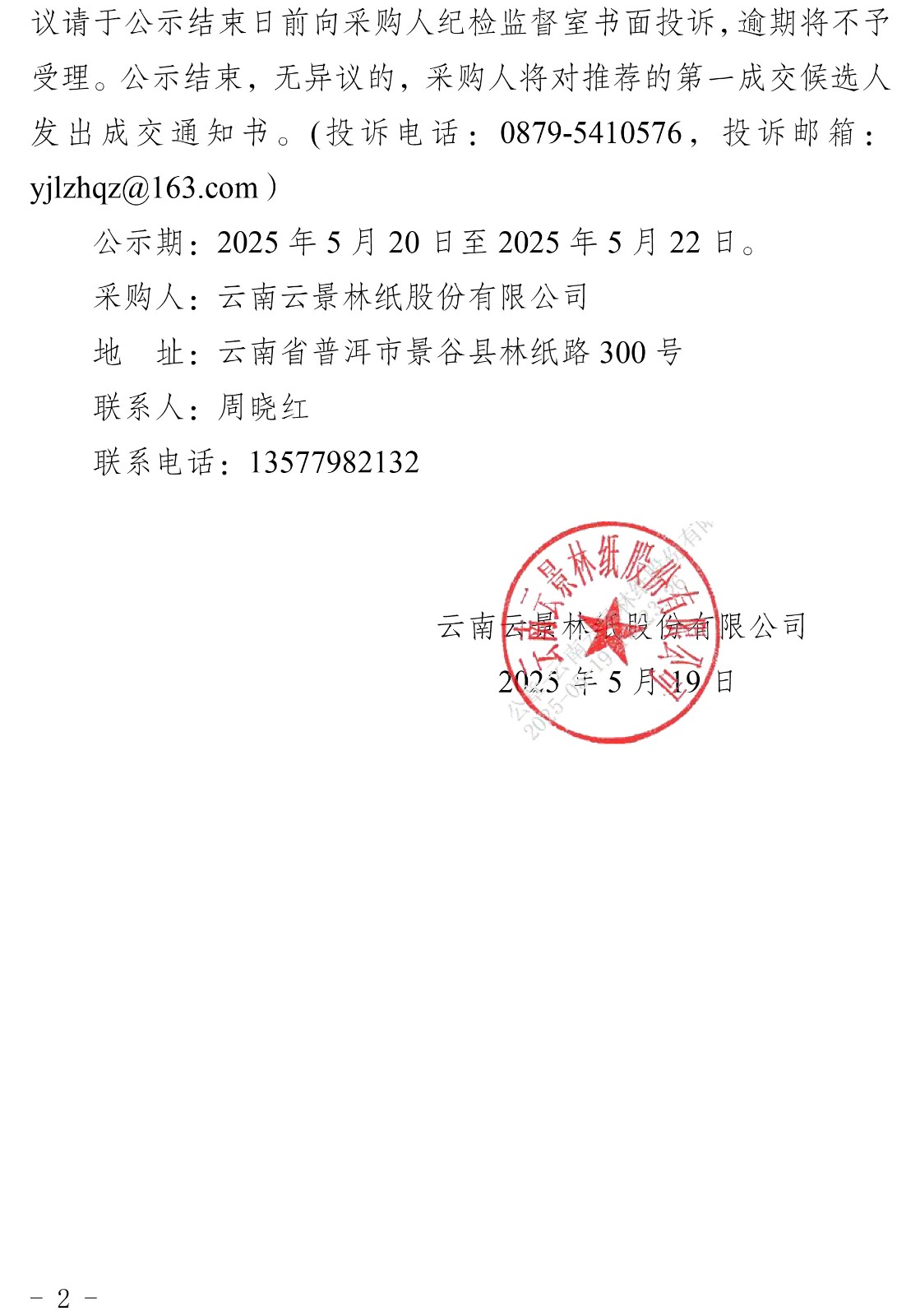 云南云景林紙股份有限公司地表水現(xiàn)狀監(jiān)測服務(wù)單位邀請詢比采購成交候選人公示