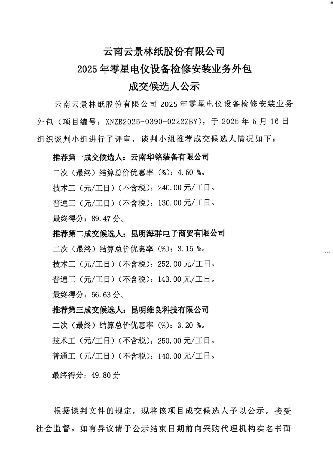 云南云景林紙股份有限公司 2025年零星電儀設(shè)備檢修安裝業(yè)務(wù)外包成交候選人公示