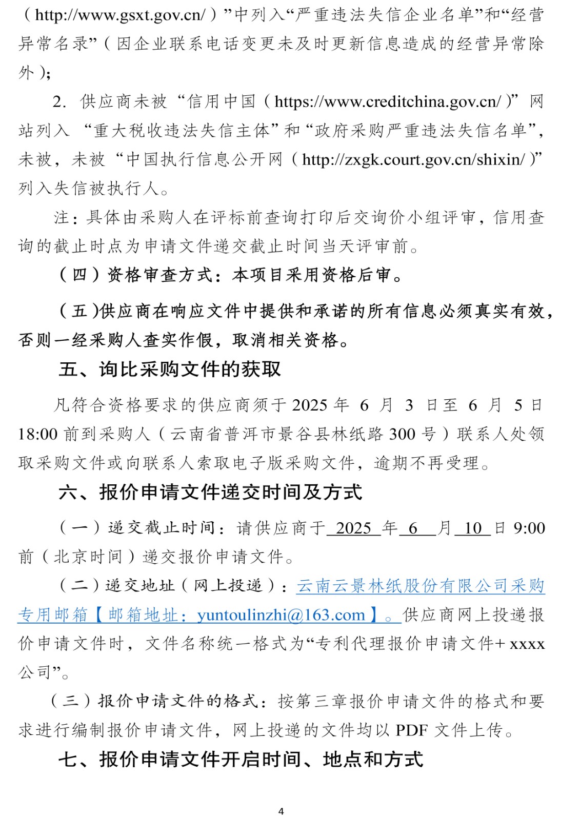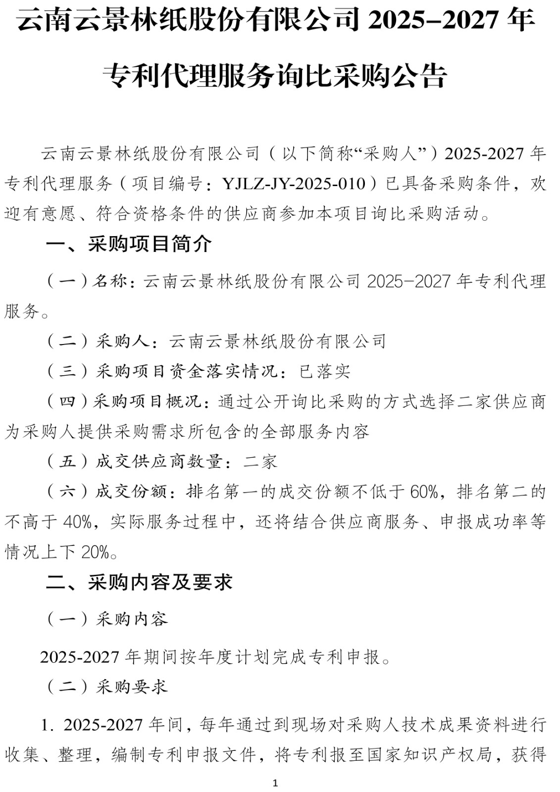 云南云景林紙股份有限公司2025-2027年專利代理服務(wù)詢比采購公告