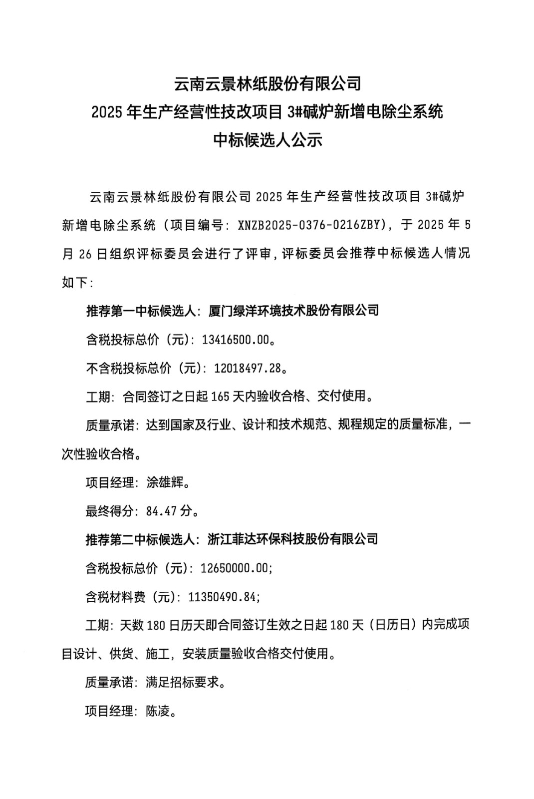 云南云景林紙股份有限公司2025年生產(chǎn)經(jīng)營性技改項目3#堿爐新增電除塵系統(tǒng)中標(biāo)候選人公示