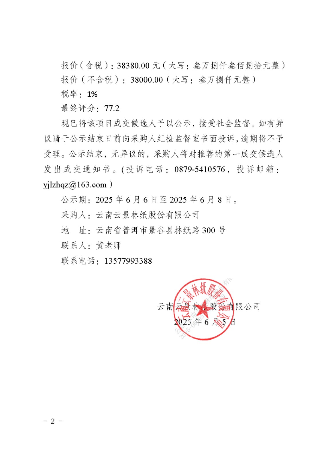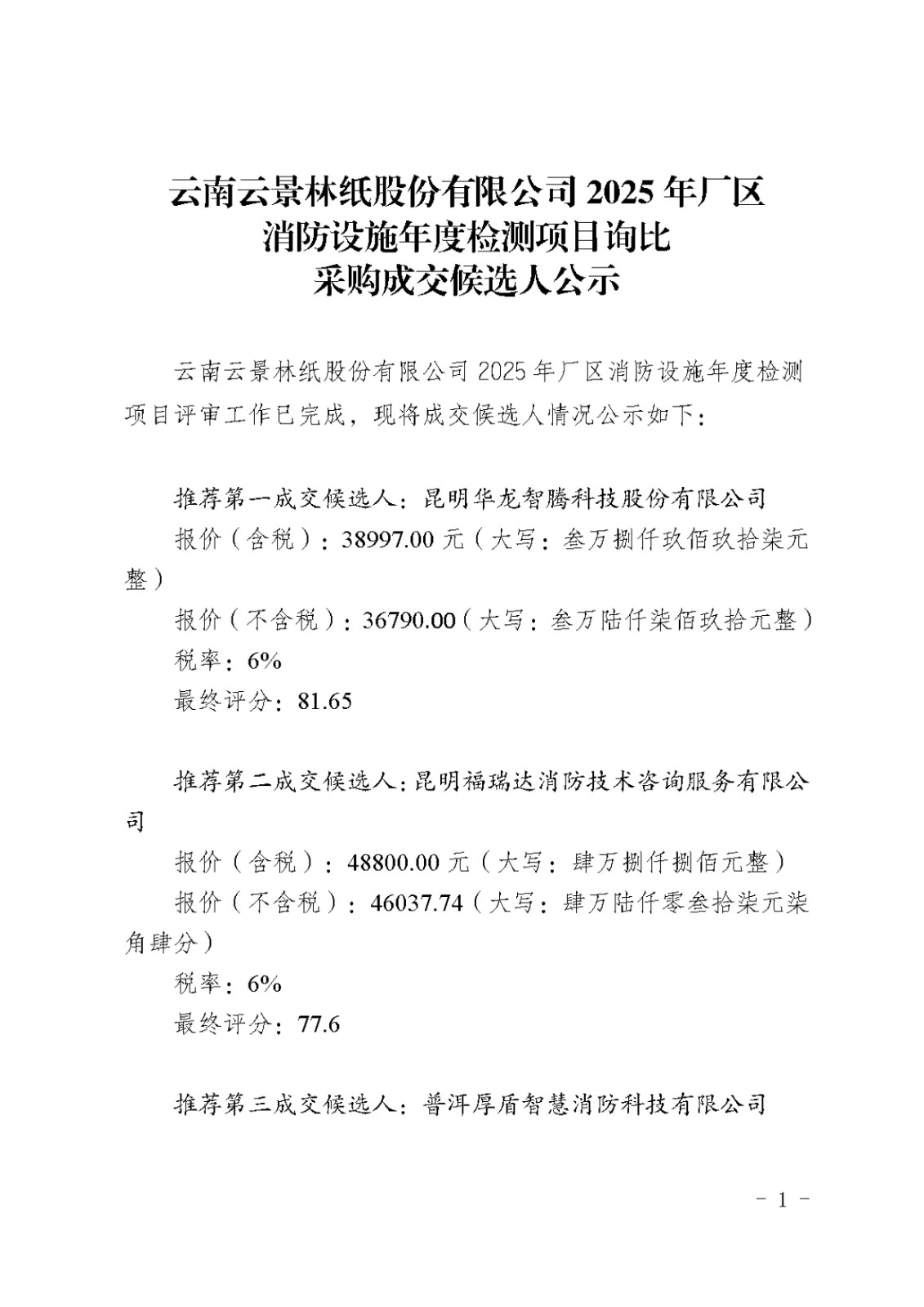 云南云景林紙股份有限公司2025年廠區(qū)消防設(shè)施年度檢測項目詢比采購成交候選人公示