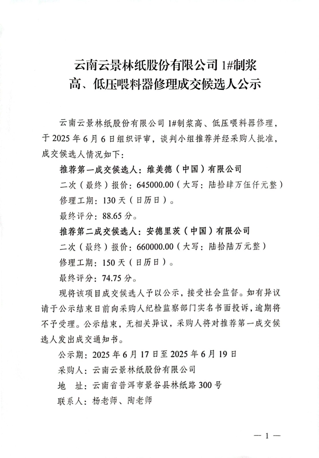 云南云景林紙股份有限公司1#制漿 高、低壓喂料器修理成交候選人公示
