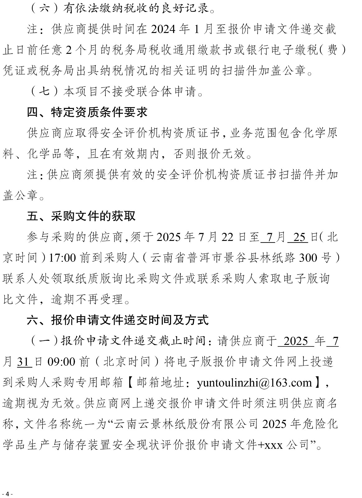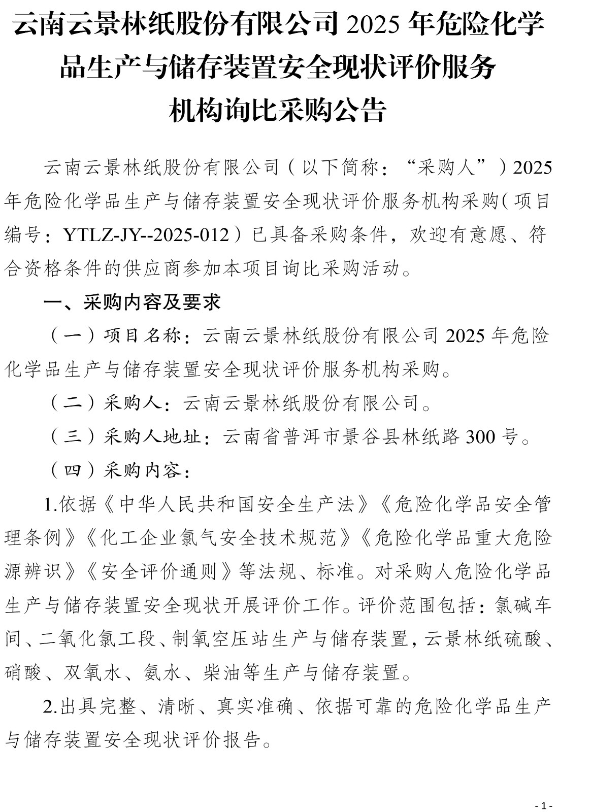 云南云景林紙股份有限公司2025年危險化學品生產與儲存裝置安全現(xiàn)狀評價服務機構詢比采購公告