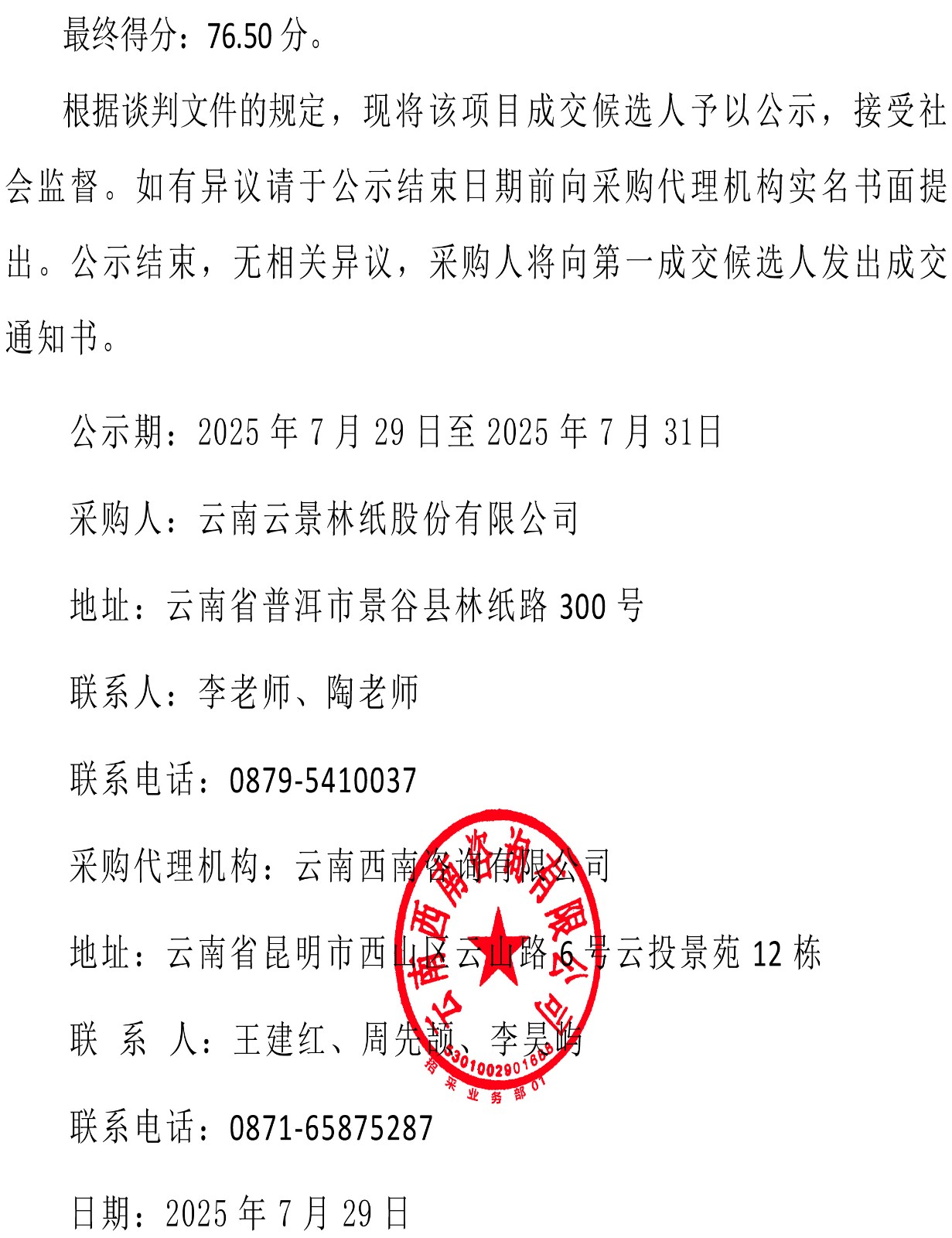 云南云景林紙股份有限公司2025年零星玻璃鋼修理業(yè)務外包成交候選人公示