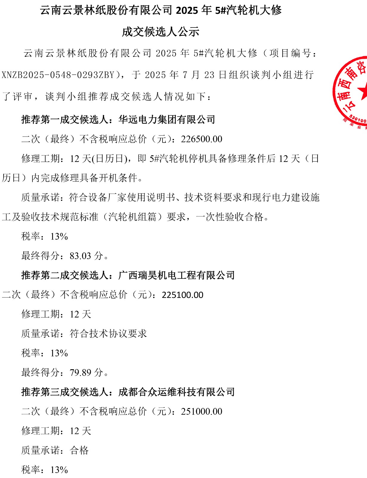 云南云景林紙股份有限公司2025年5#汽輪機大修成交候選人公示