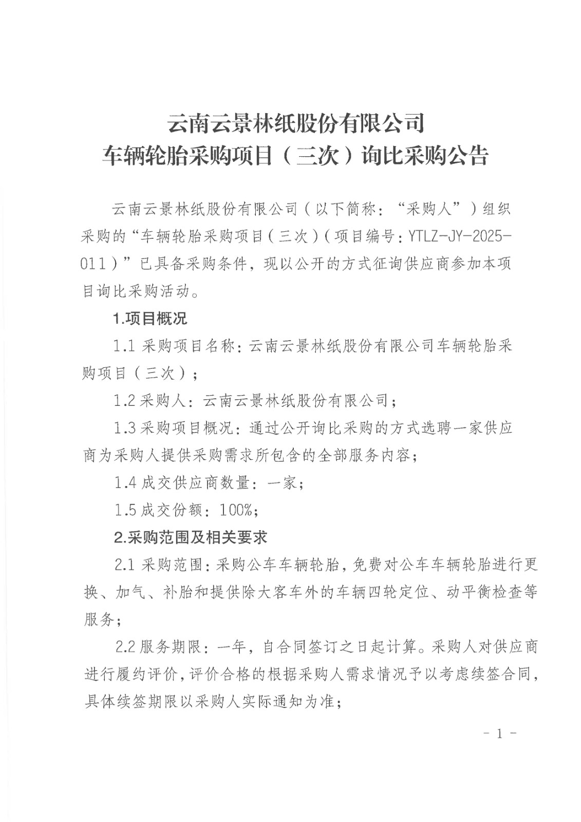 云南云景林紙股份有限公司車輛輪胎采購項目(三次)詢比采購公告