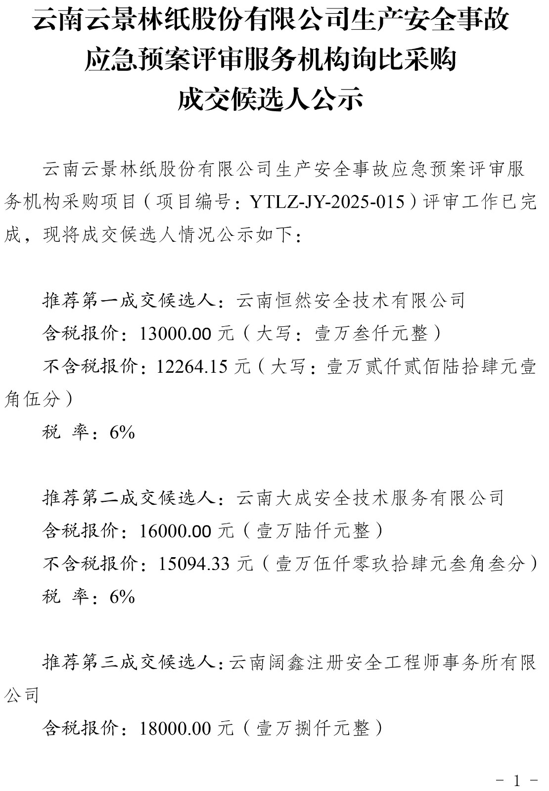 云南云景林紙股份有限公司生產安全事故應急預案評審服務機構詢比采購成交候選人公示