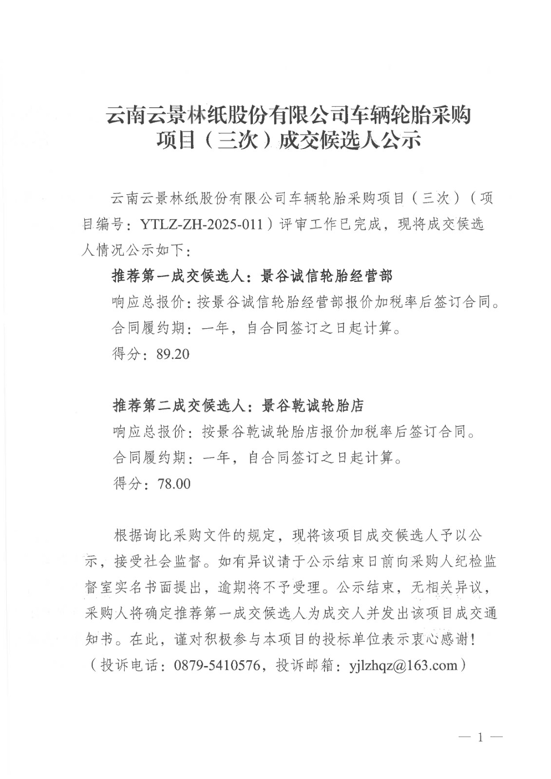云南云景林紙股份有限公司車輛輪胎采購項(xiàng)目(三次)成交候選人公示