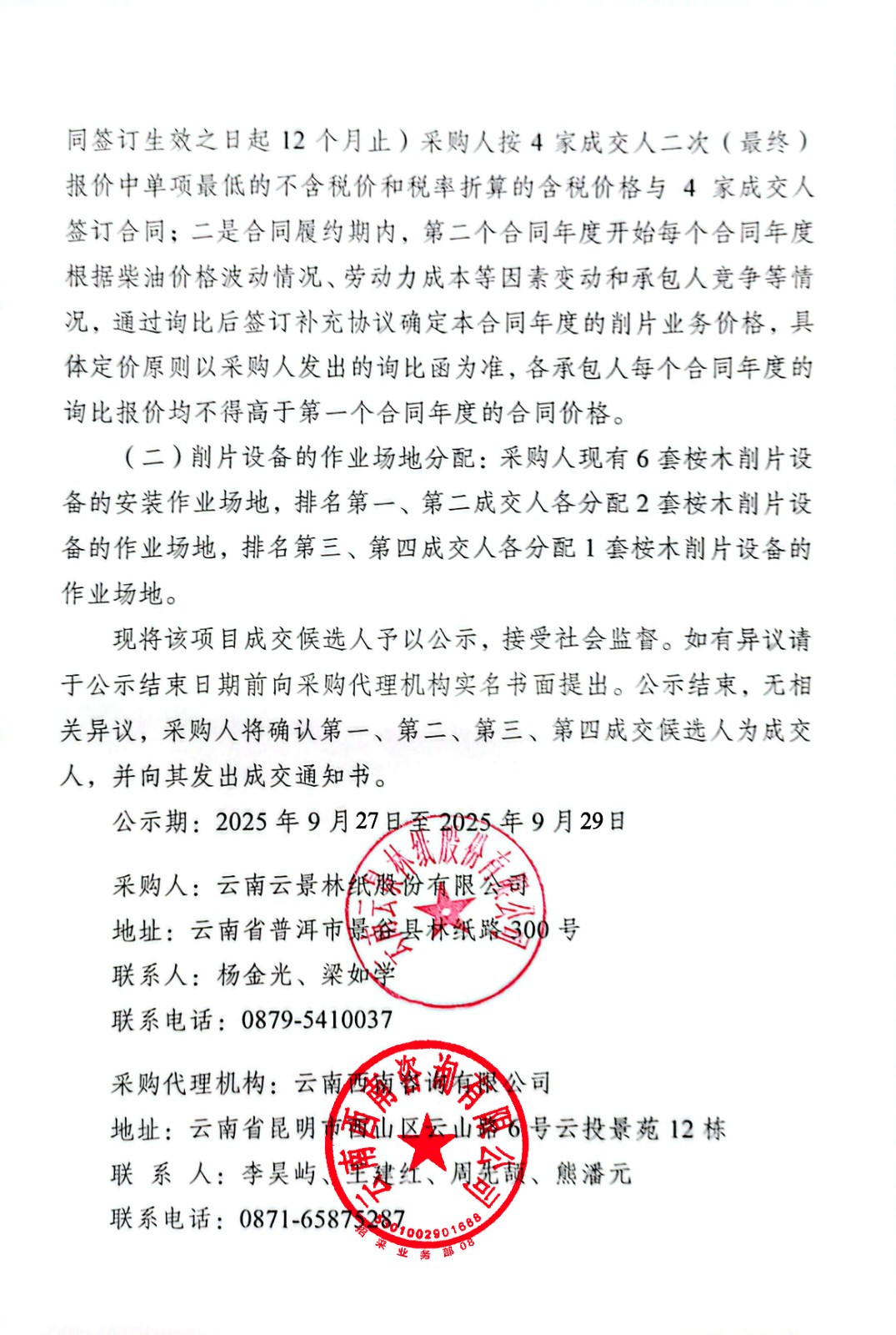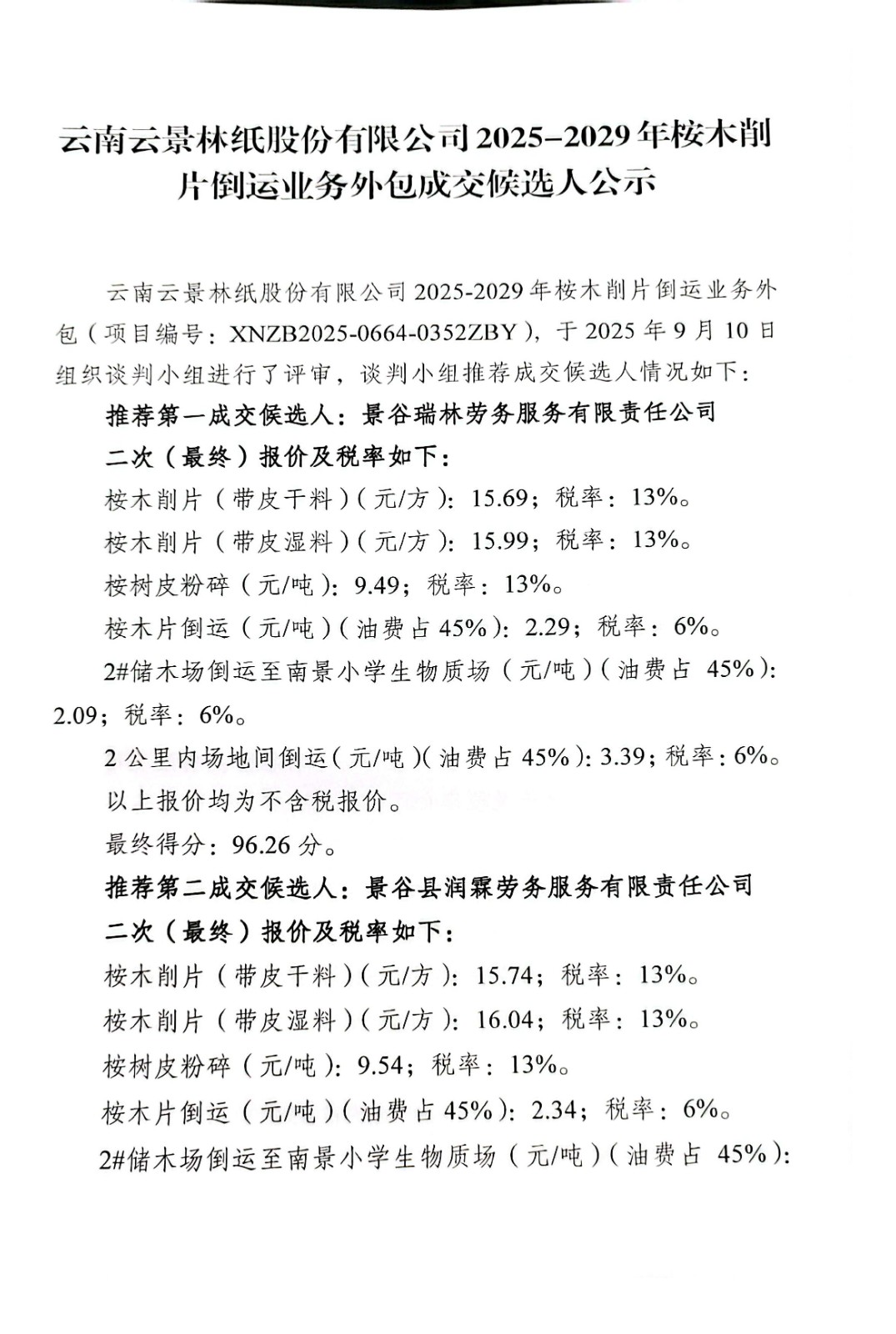 云南云景林紙股份有限公司2025-2029年松木削片倒運業(yè)務(wù)外包成交候選人公示