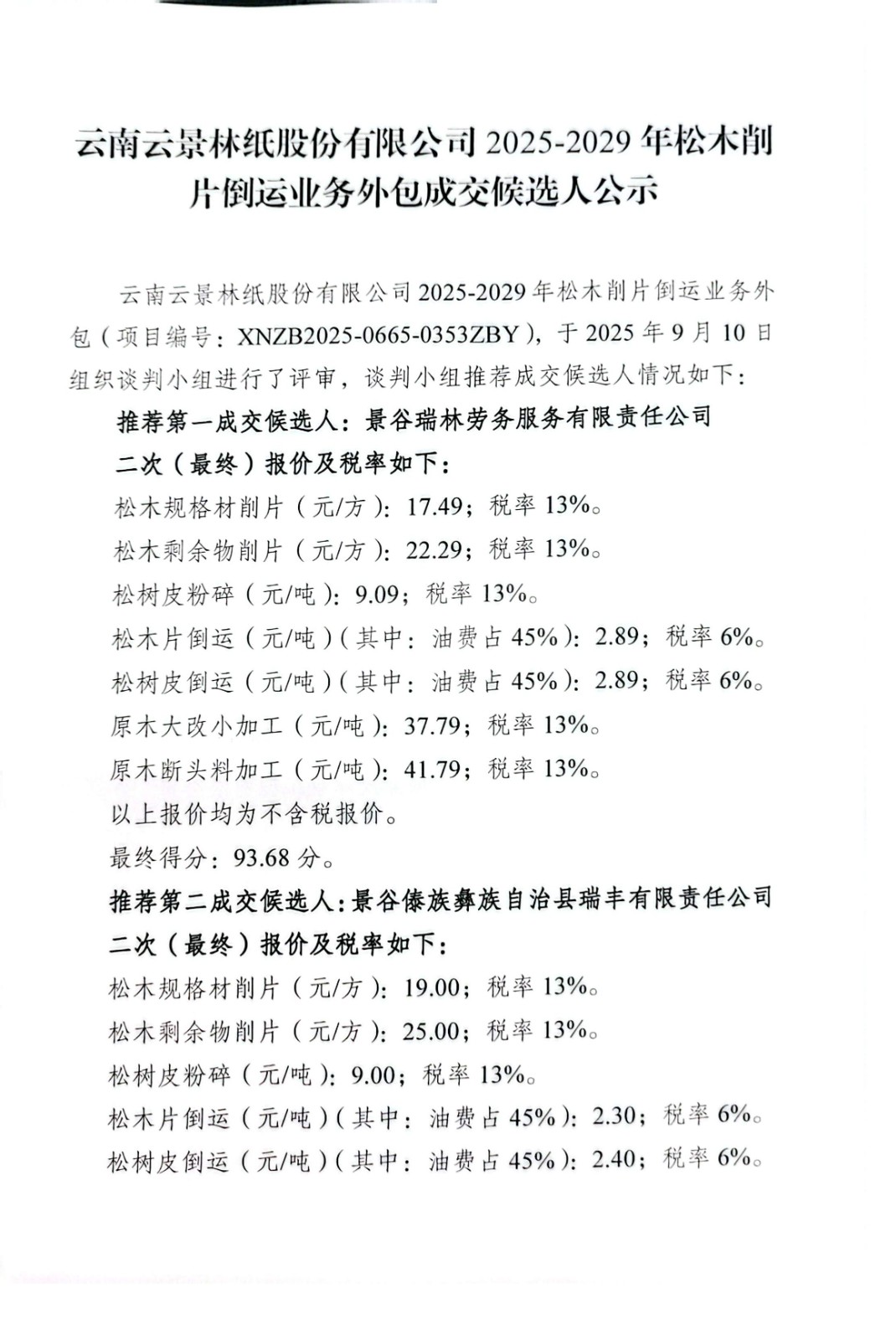 云南云景林紙股份有限公司2025-2029年松木削片倒運(yùn)業(yè)務(wù)外包成交候選人公示