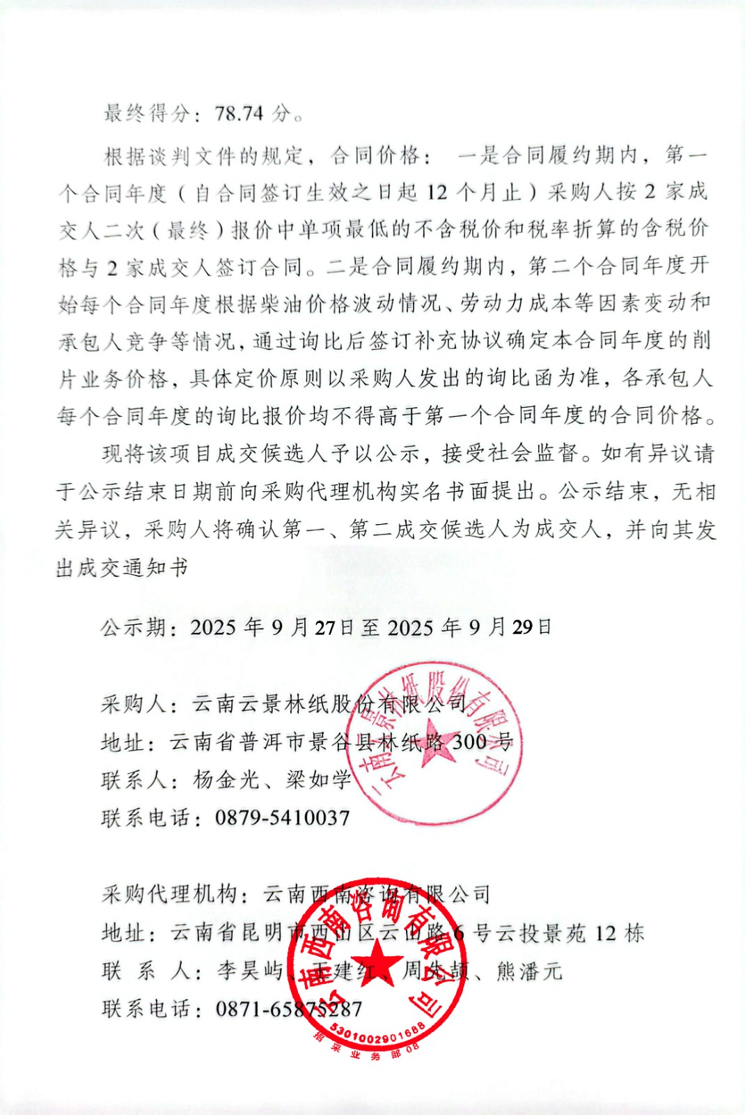 云南云景林紙股份有限公司2025-2029年木削片倒運(yùn)業(yè)務(wù)外包成交候選人公示