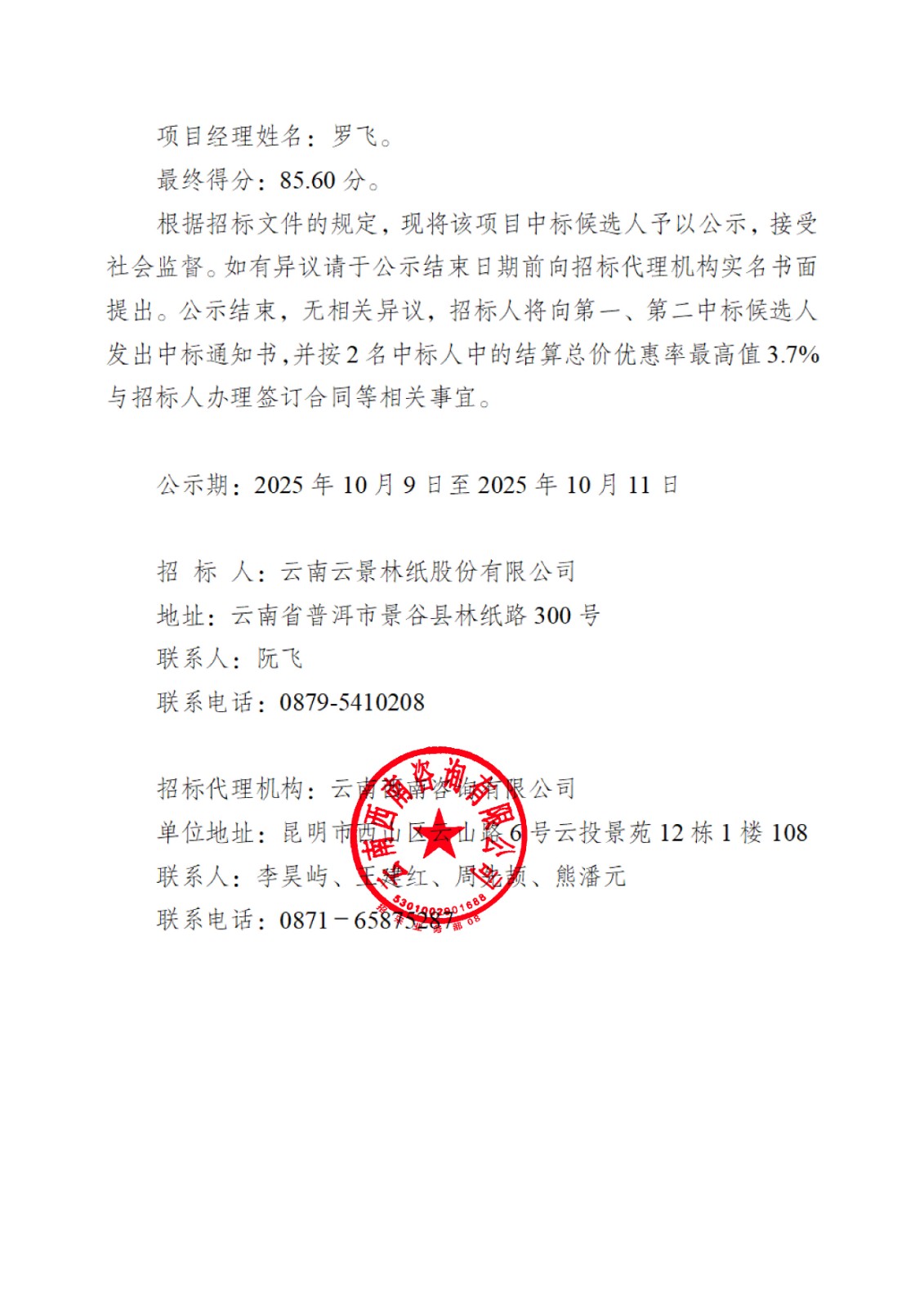 云南云景林紙股份有限公司2026年建構筑物維修搶修改造施工中標候選人公示