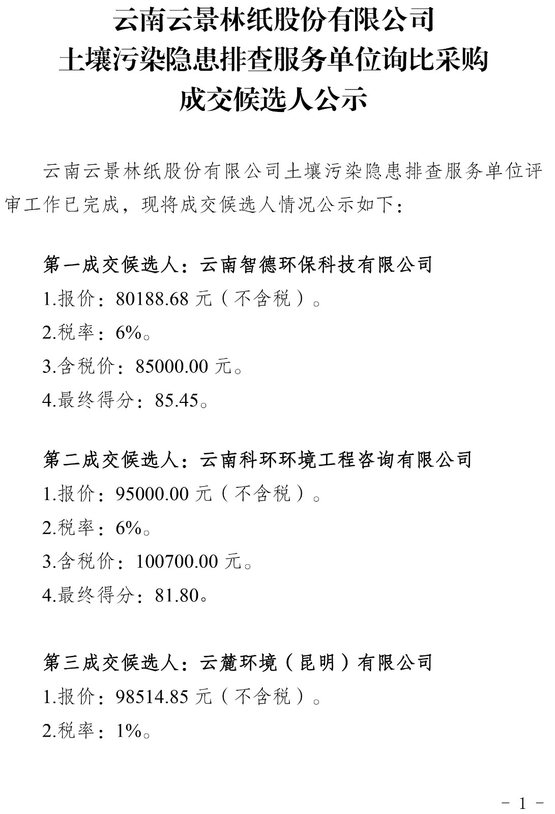 云南云景林紙股份有限公司土壤污染隱患排查服務單位詢比采購成交候選人公示