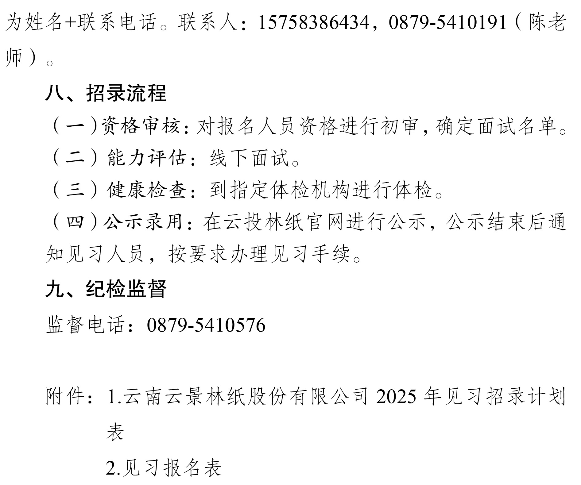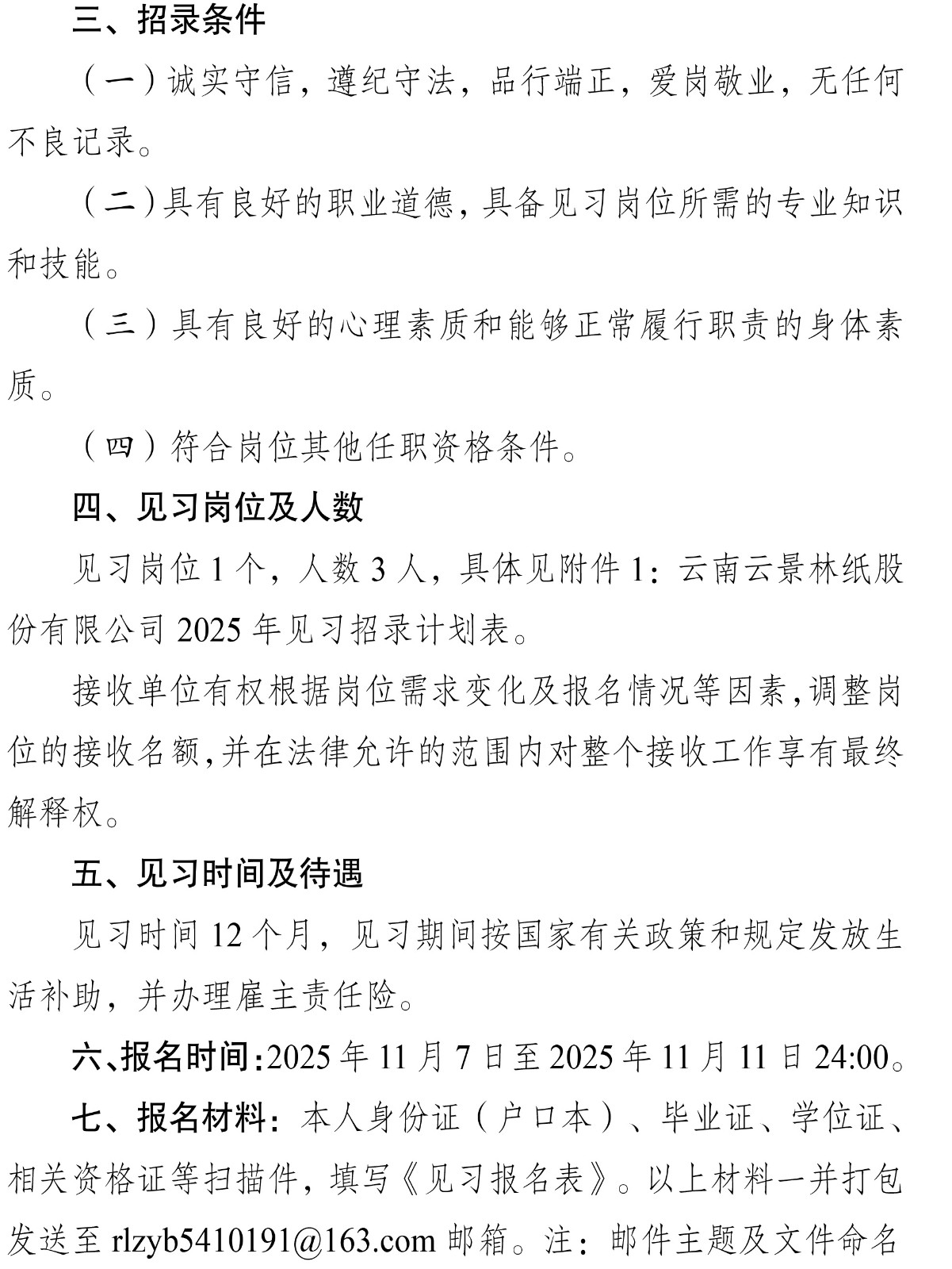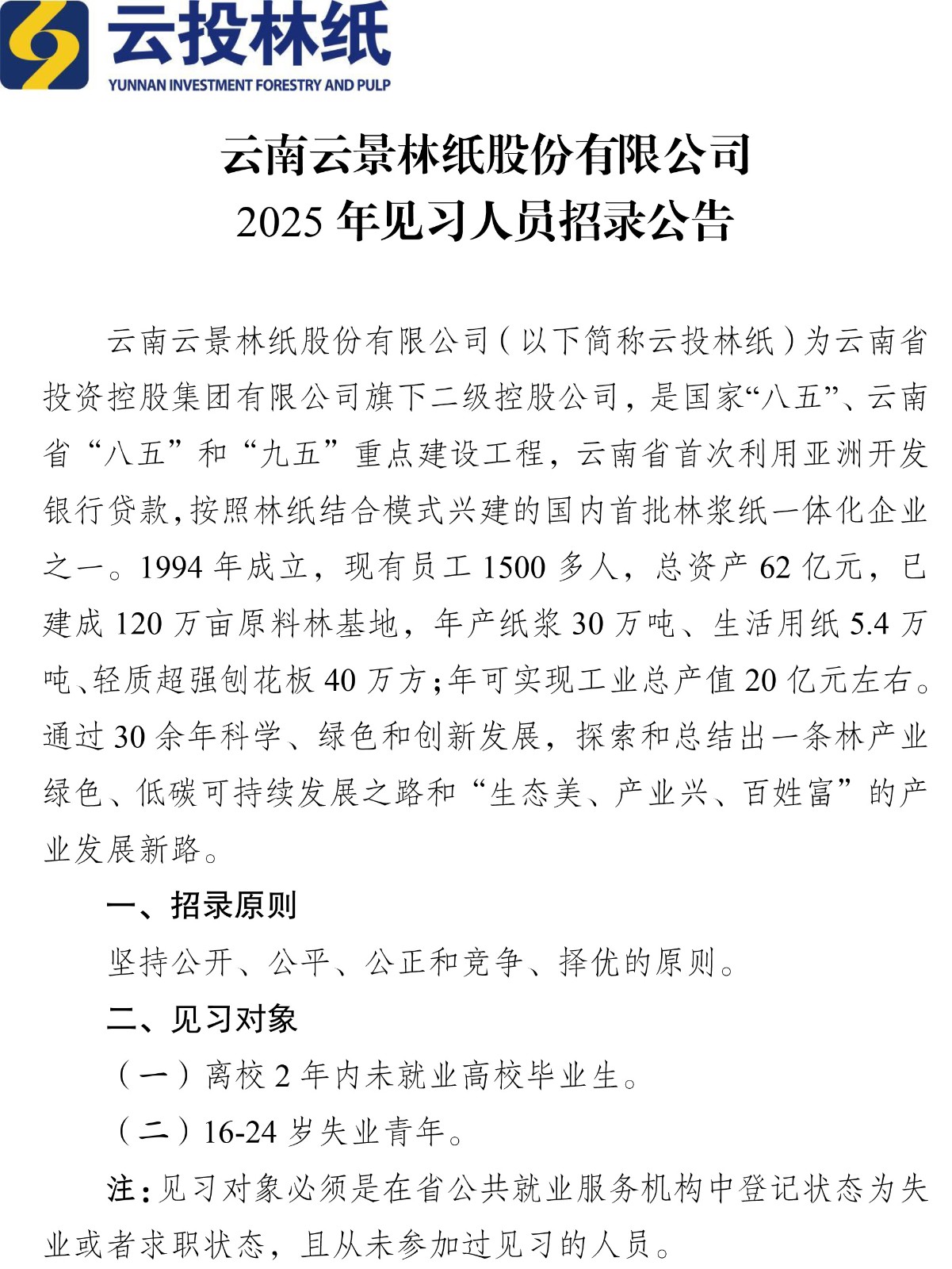 云南云景林紙股份有限公司 2025年見習(xí)人員招錄公告