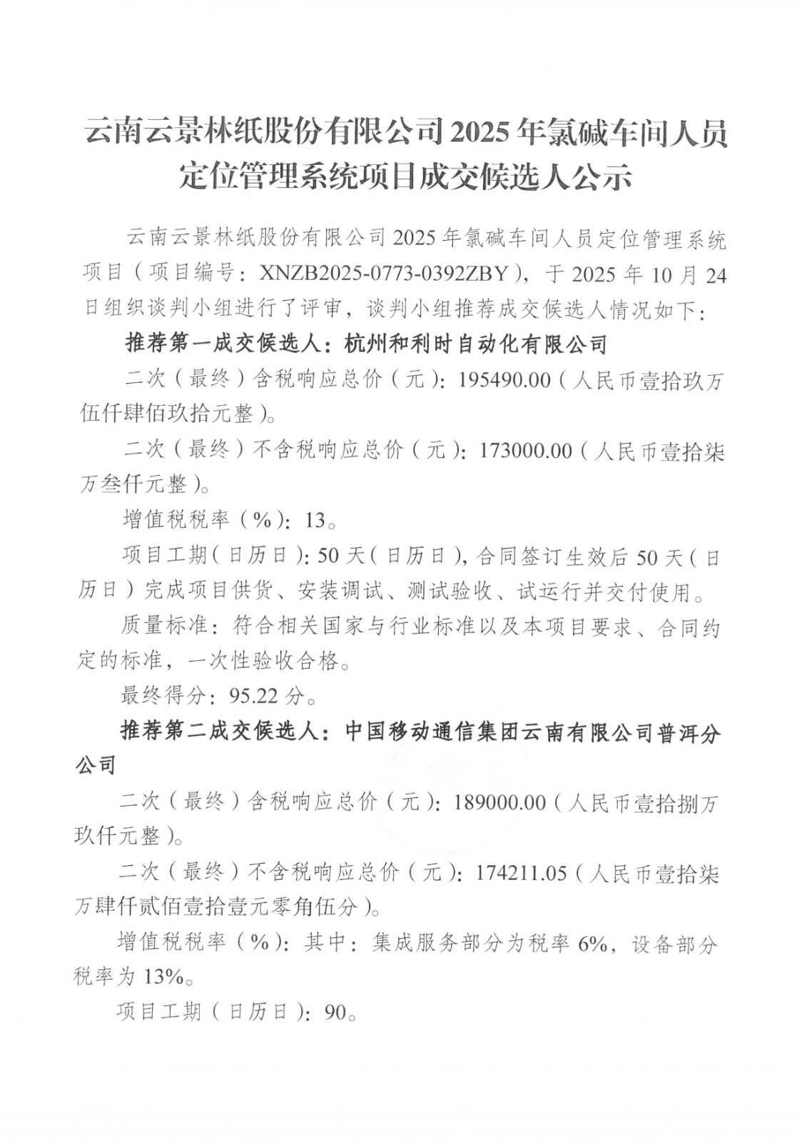 云南云景林紙股份有限公司2025年氯堿車間人員定位管理系統(tǒng)項目成交候選人公示