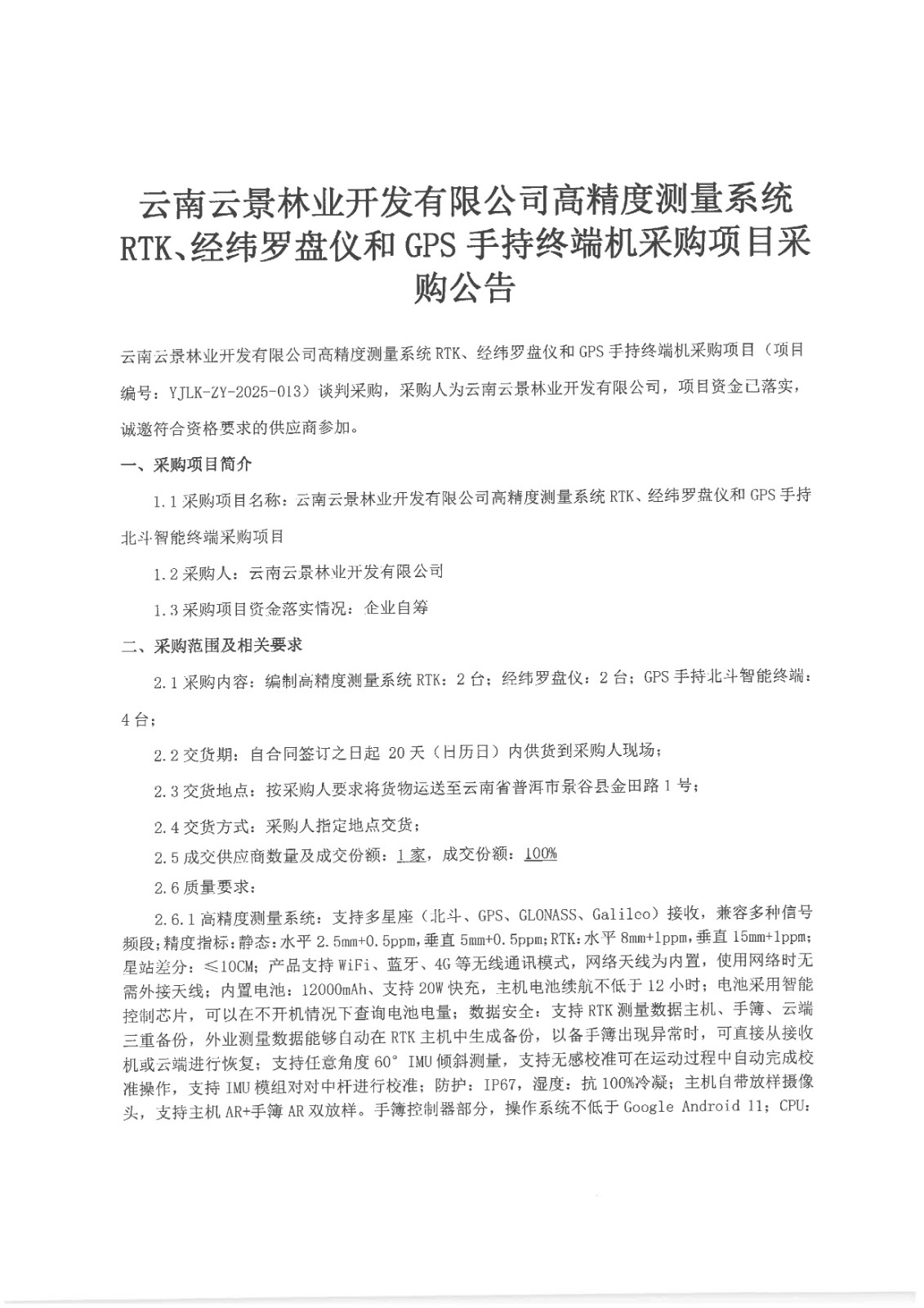 云南云景林業(yè)開發(fā)有限公司高精度測量系統(tǒng)RTK、經(jīng)緯羅盤儀和GPS手持終端機采購項目采購公告