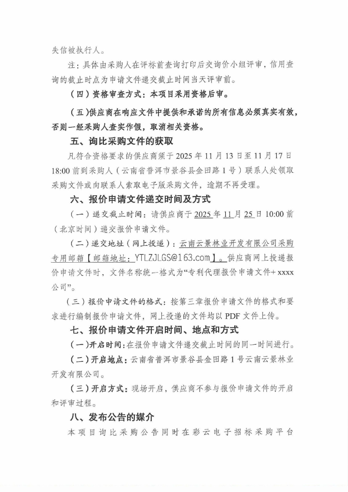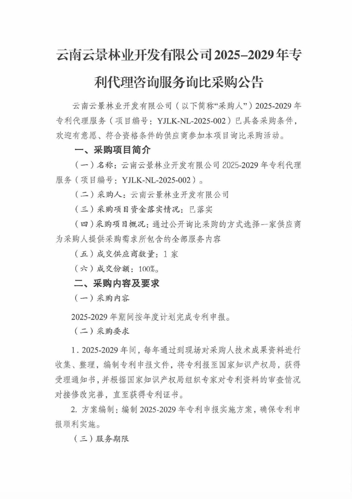 云南云景林業(yè)開發(fā)有限公司2025-2029年專利代理咨詢服務(wù)詢比采購公告