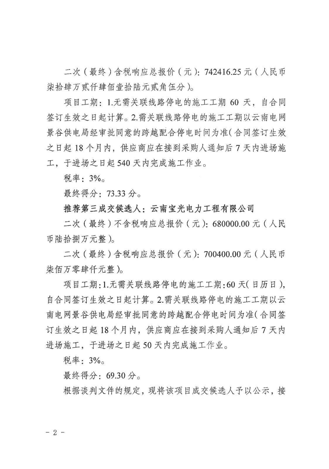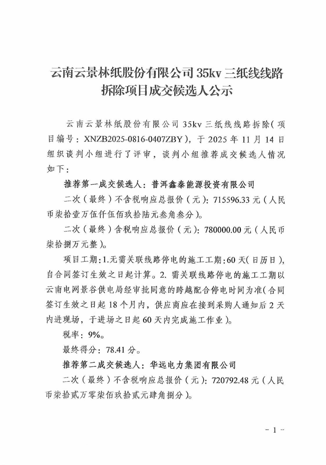 云南云景林紙股份有限公司35kv三紙線線路拆除項(xiàng)目成交候選人公示