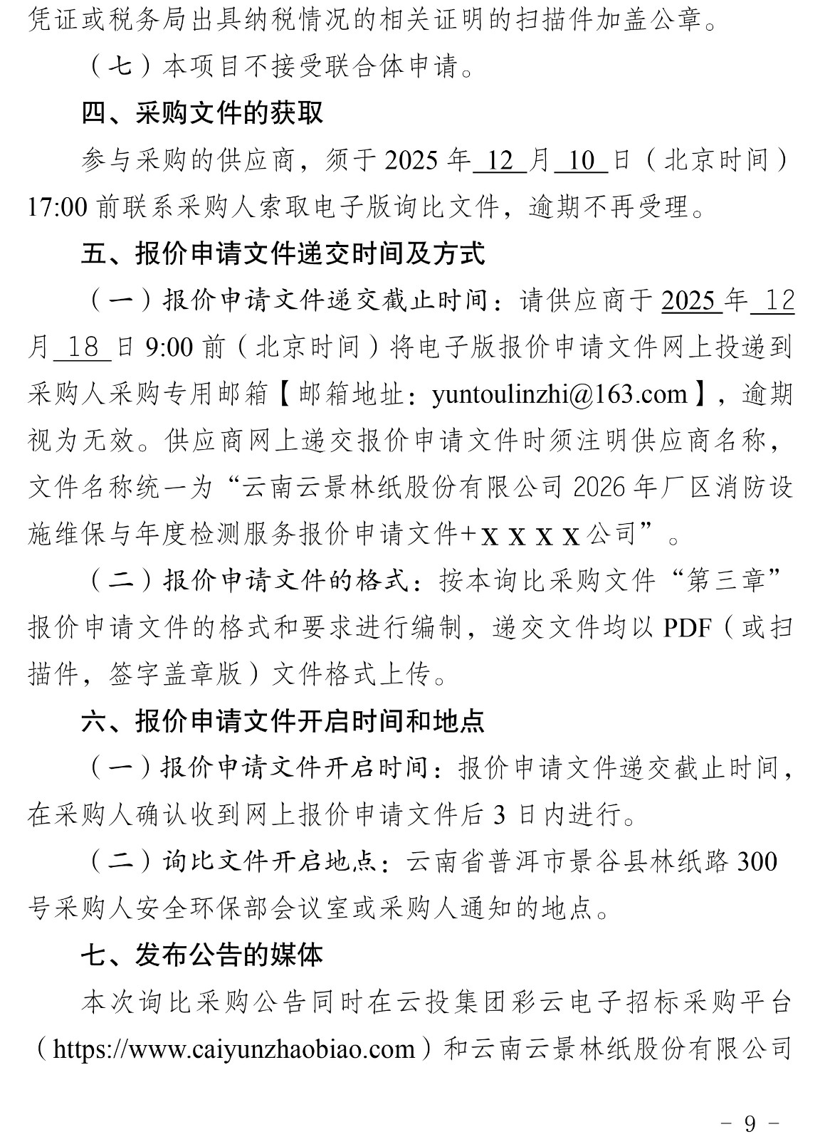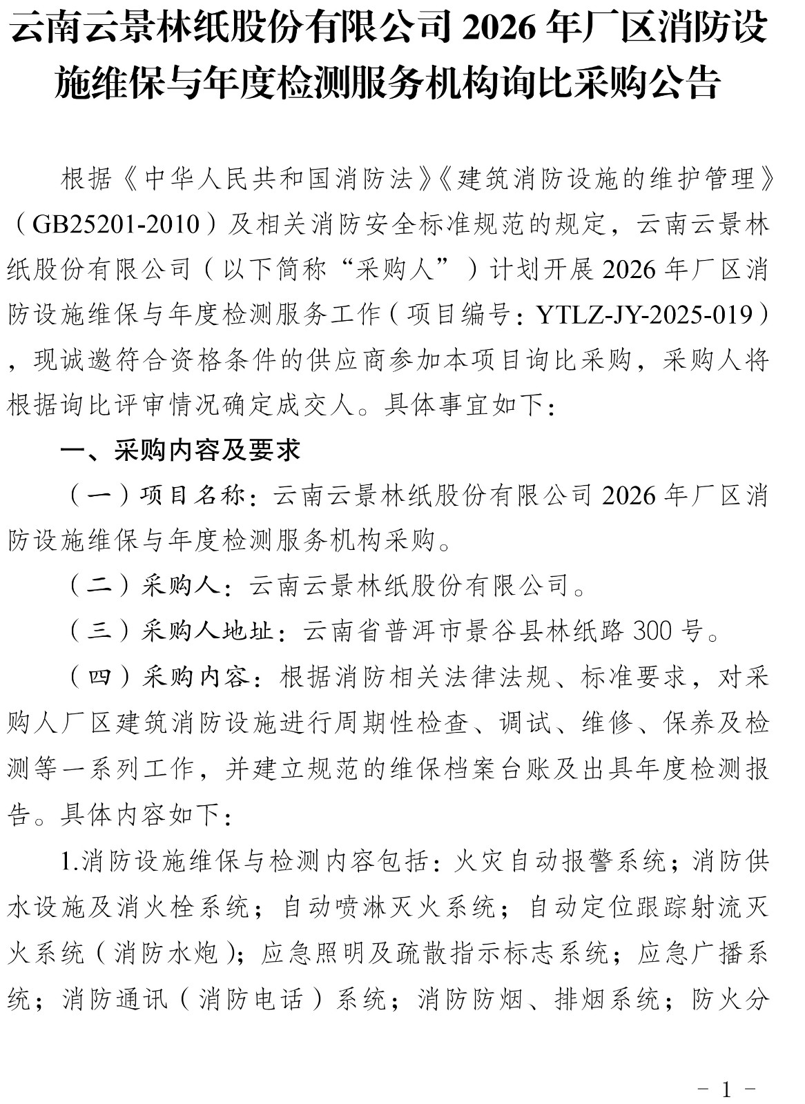 云南云景林紙股份有限公司2026年廠區(qū)消防設(shè)施維保與年度檢測服務(wù)機構(gòu)詢比采購公告