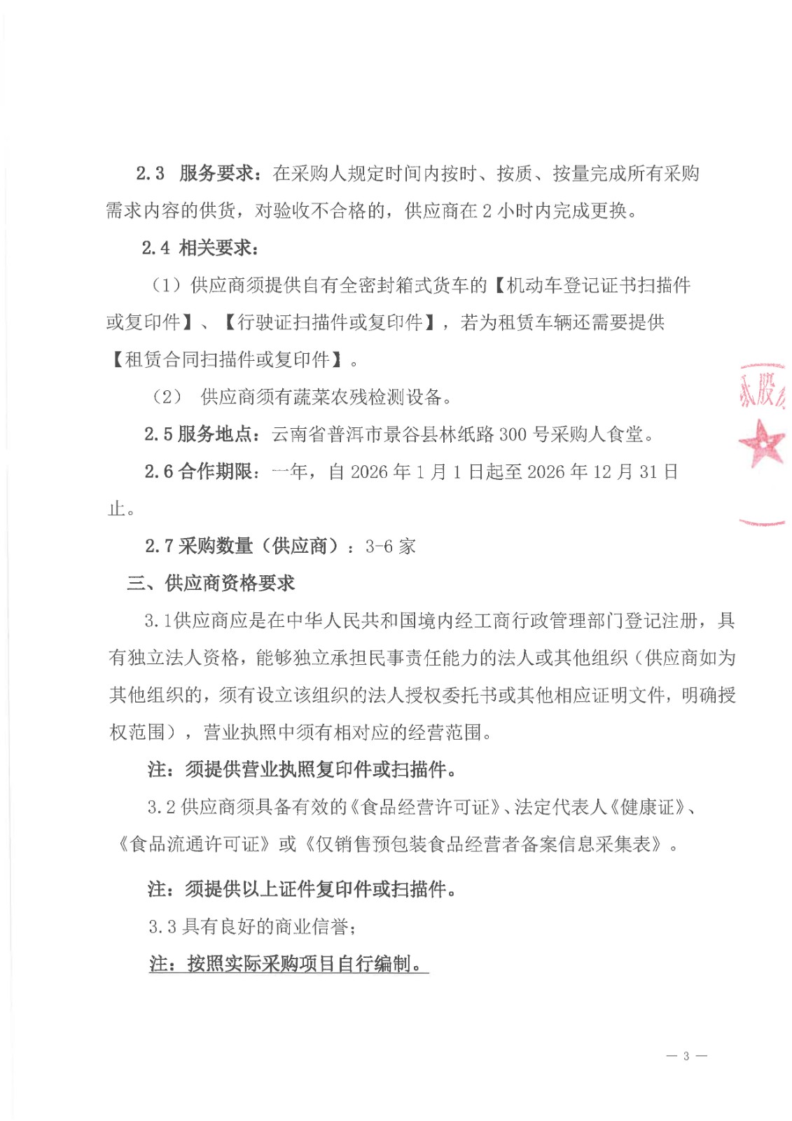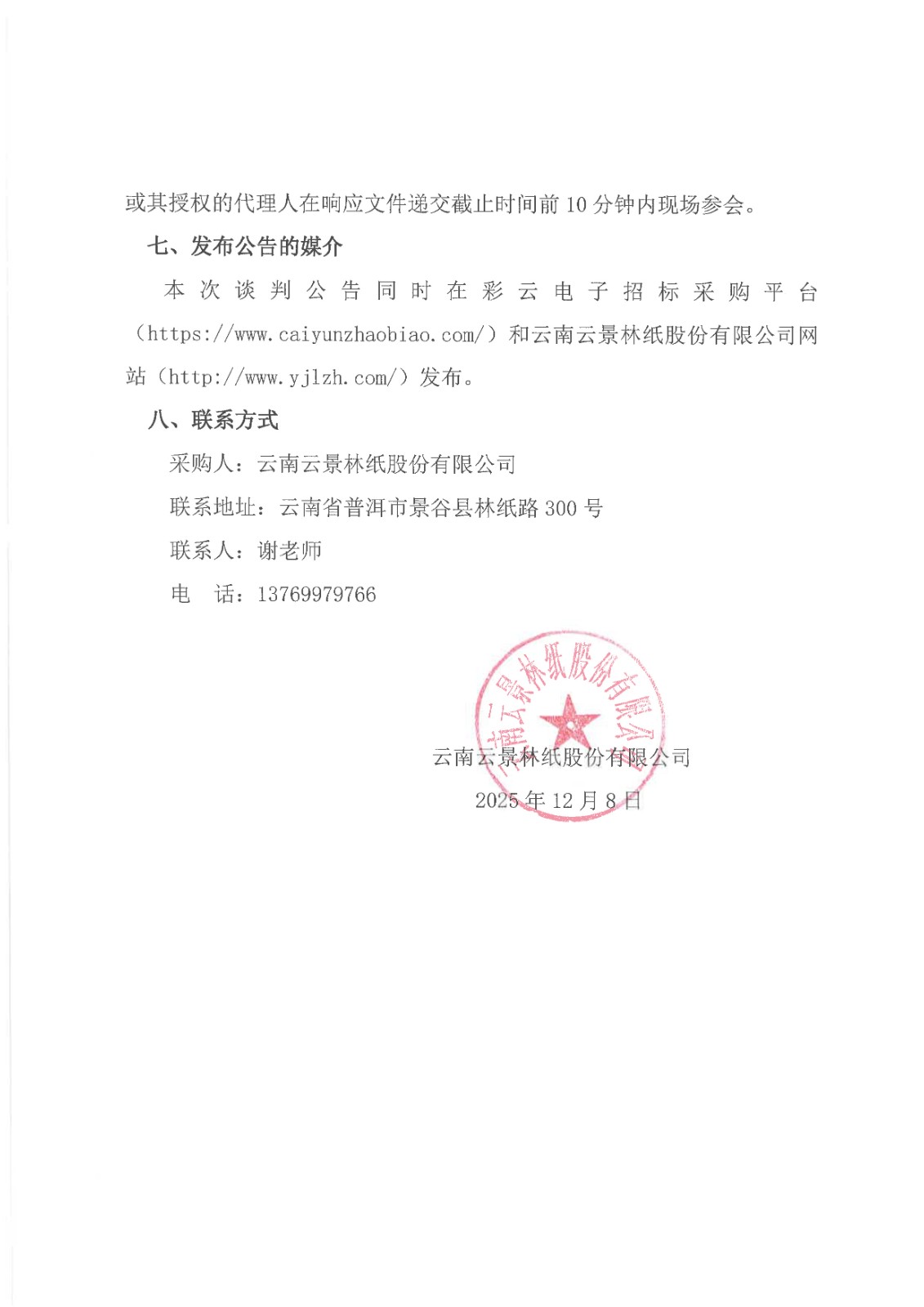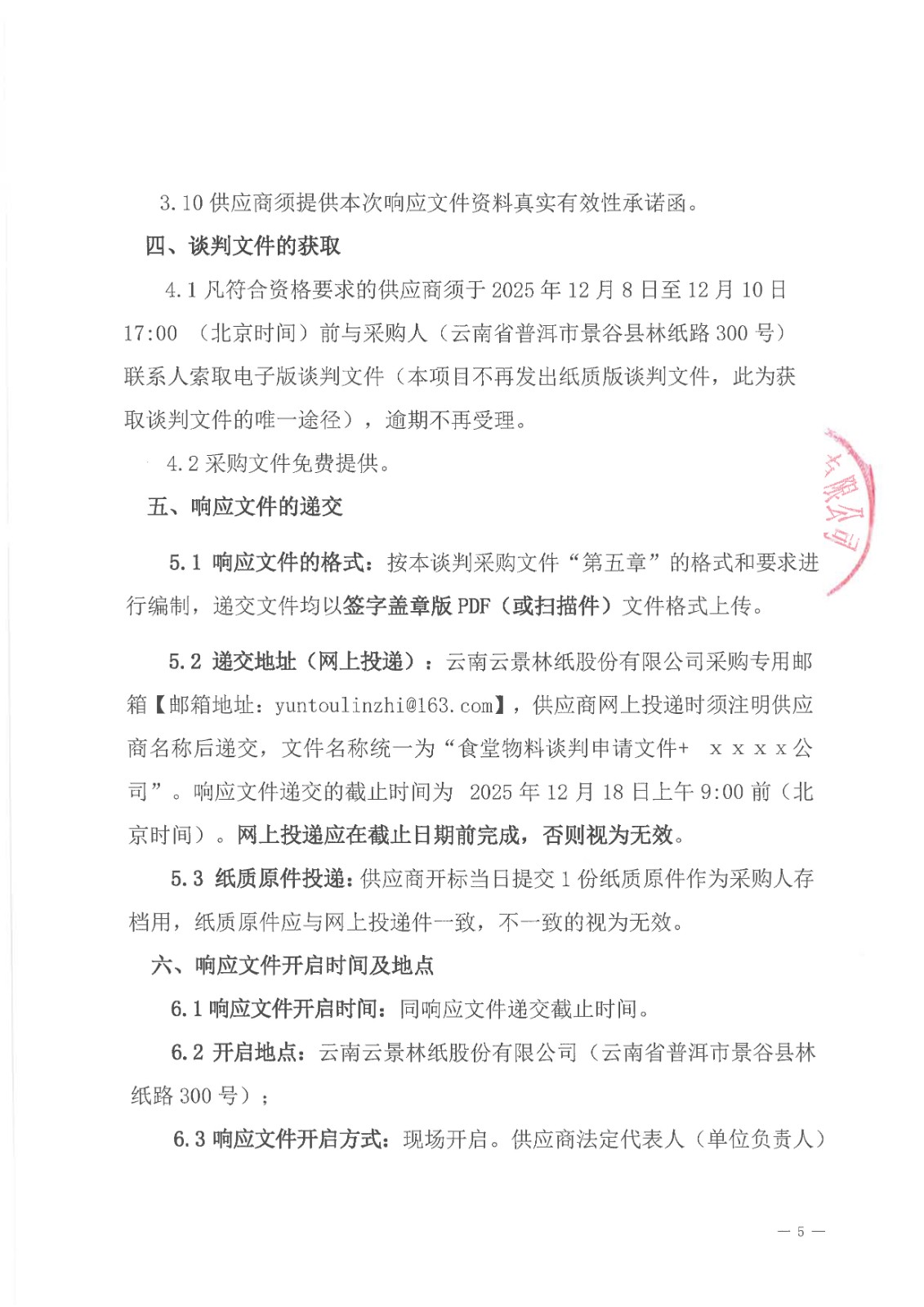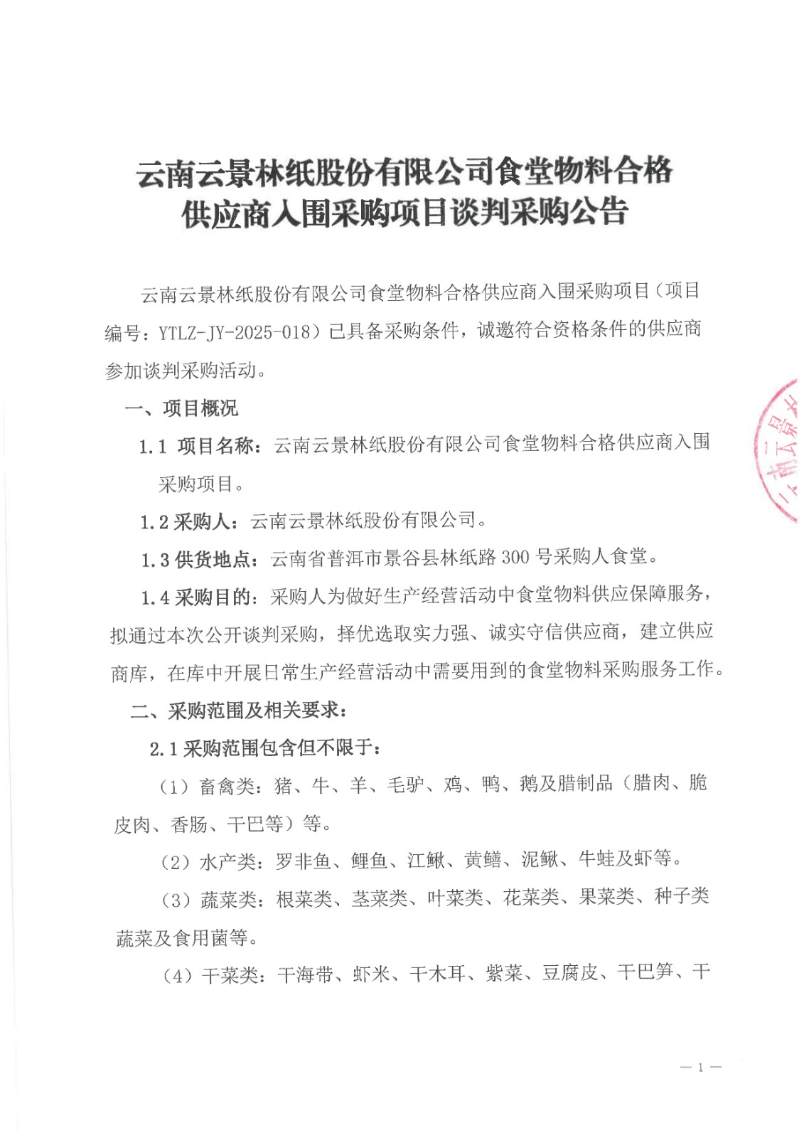 云南云景林紙股份有限公司食堂物料合格供應商人圍采購項目談判采購公告
