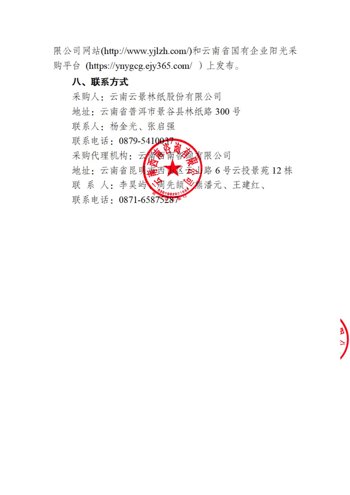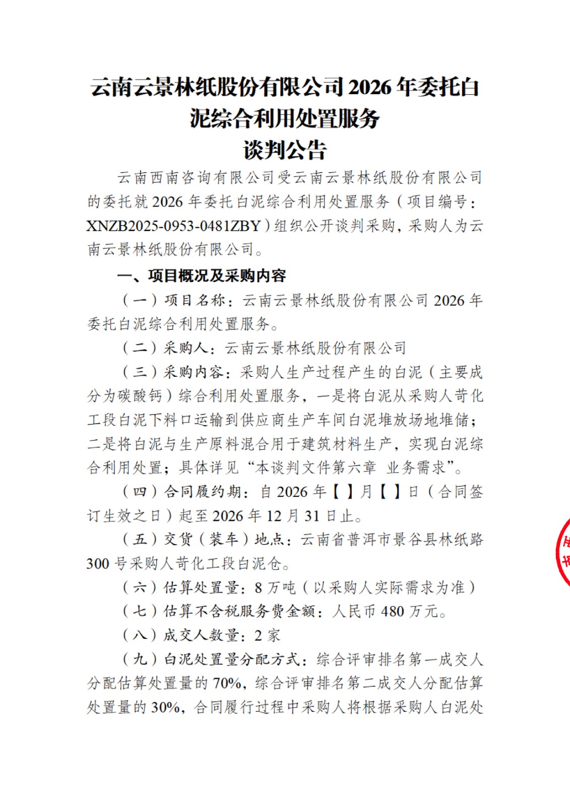 云南云景林紙股份有限公司2026年委托白泥綜合利用處置服務談判公告