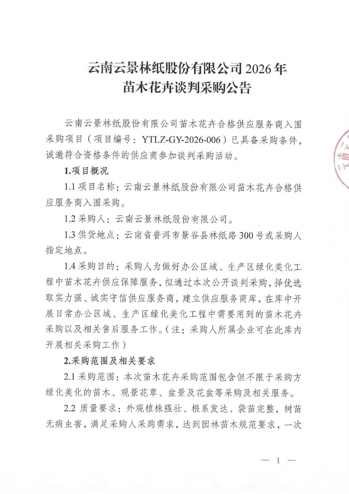 云南云景林紙股份有限公司2026年苗木花卉談判采購(gòu)公告