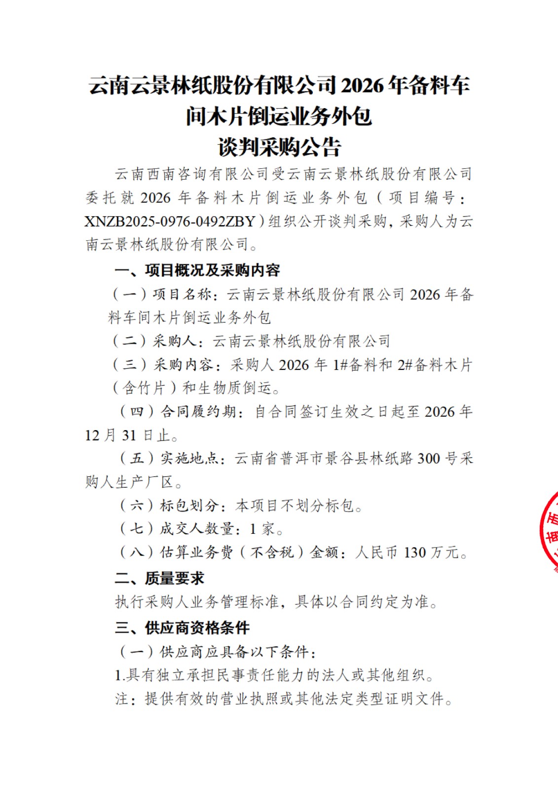 云南云景林紙股份有限公司2026年備料車間木片倒運(yùn)業(yè)務(wù)外包談判采購(gòu)公告
