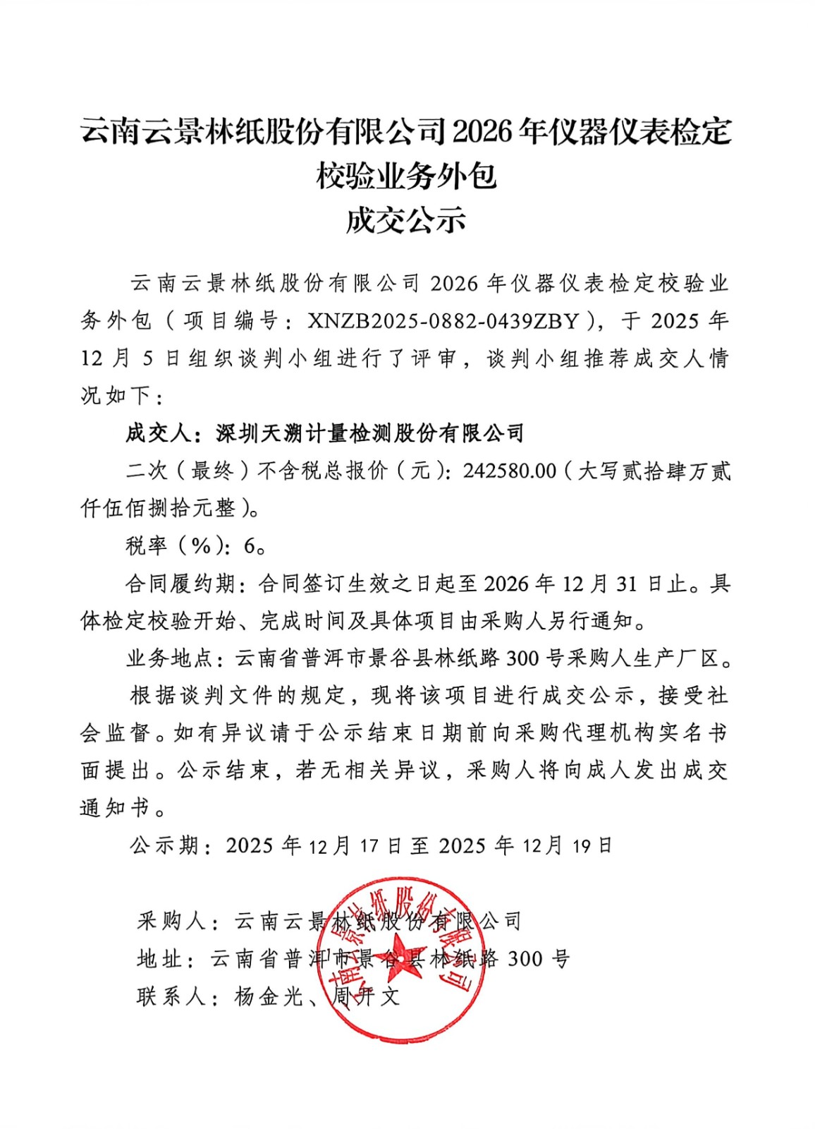 云南云景林紙股份有限公司2026年儀器儀表檢定校驗業(yè)務(wù)外包成交公示