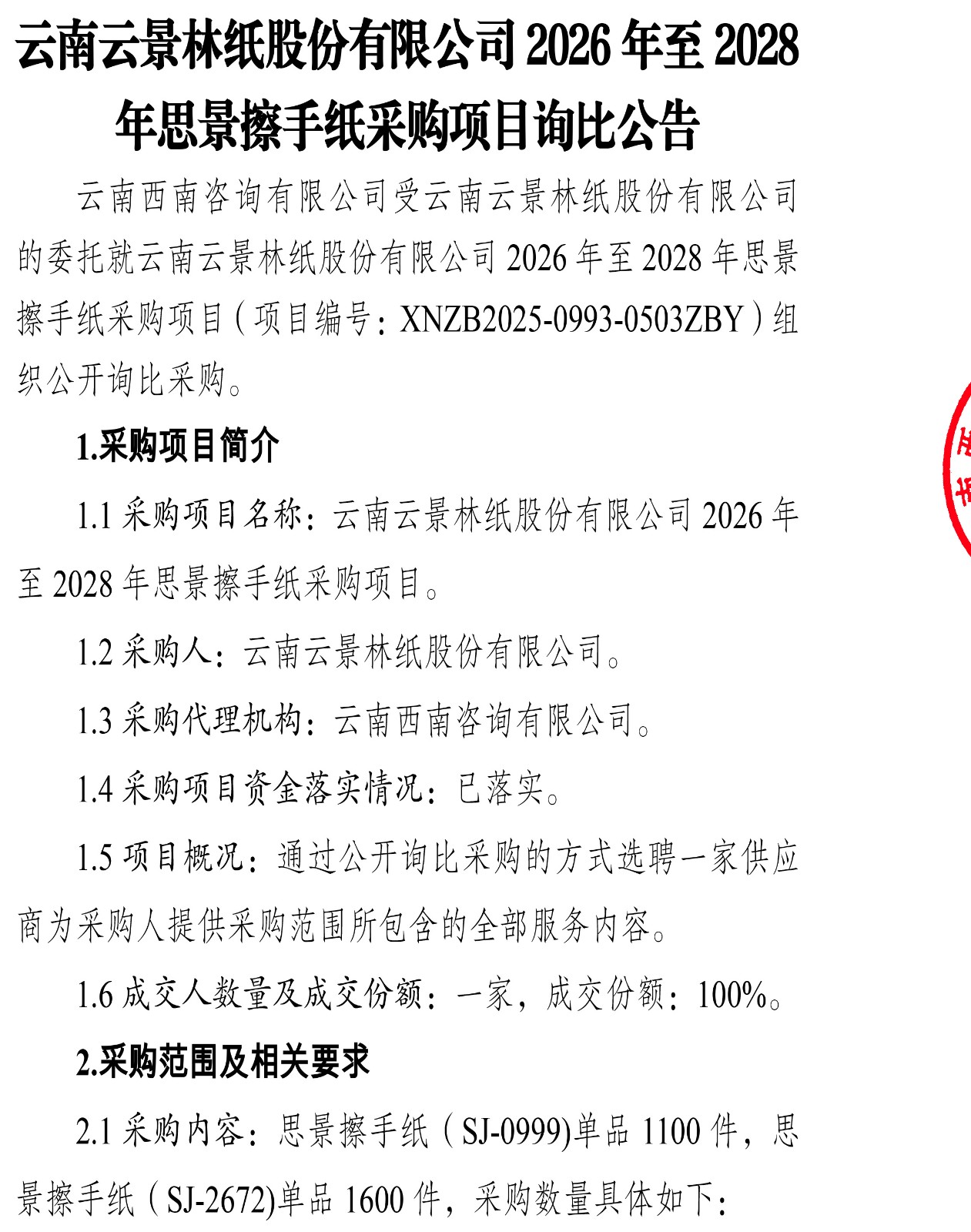 云南云景林紙股份有限公司2026年至2028年思景擦手紙采購項(xiàng)目詢比公告