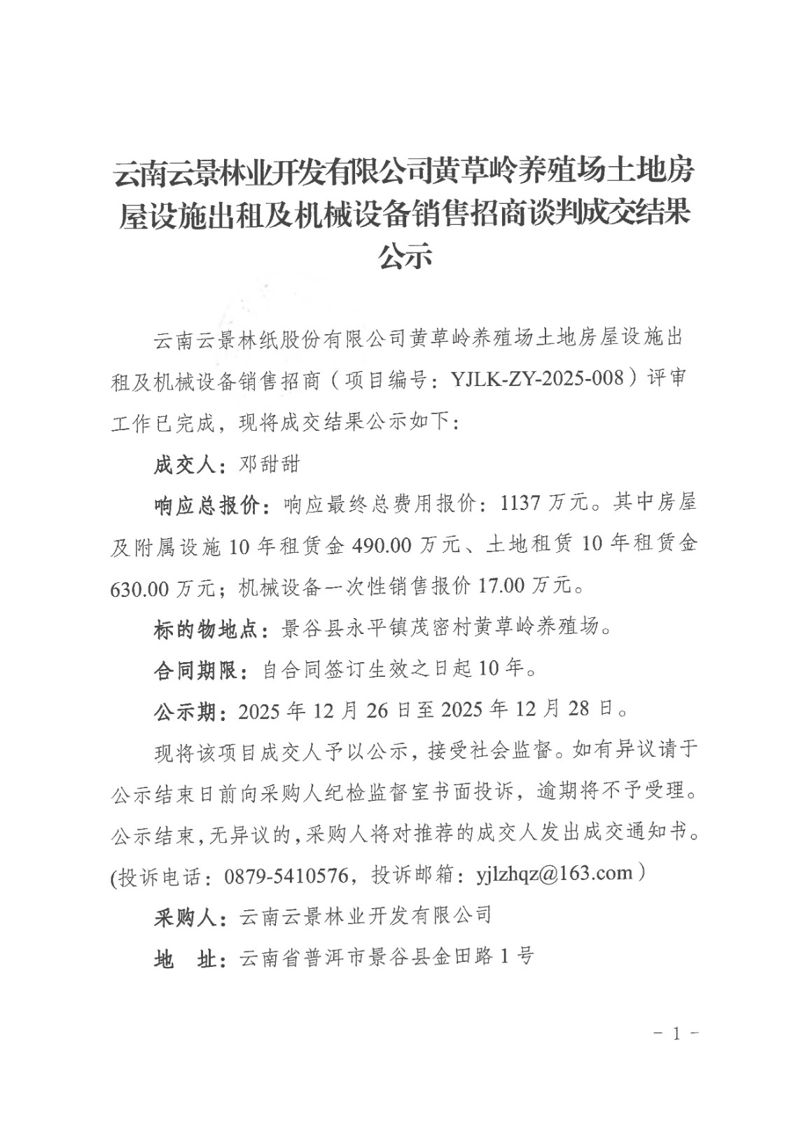 云南云景林業(yè)開發(fā)有限公司黃草嶺養(yǎng)殖場(chǎng)土地房屋設(shè)施出租及機(jī)械設(shè)備銷售招商談判成交結(jié)果公示