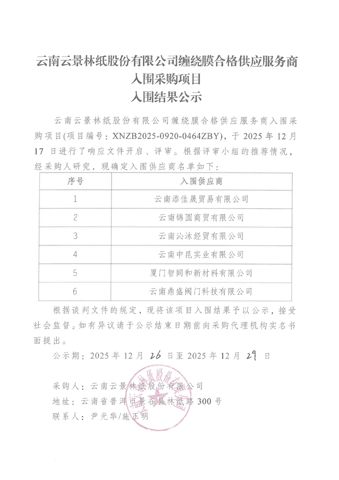 云南云景林紙股份有限公司纏繞膜合格供應(yīng)服務(wù)商入圍采購項(xiàng)目入圍結(jié)果公示
