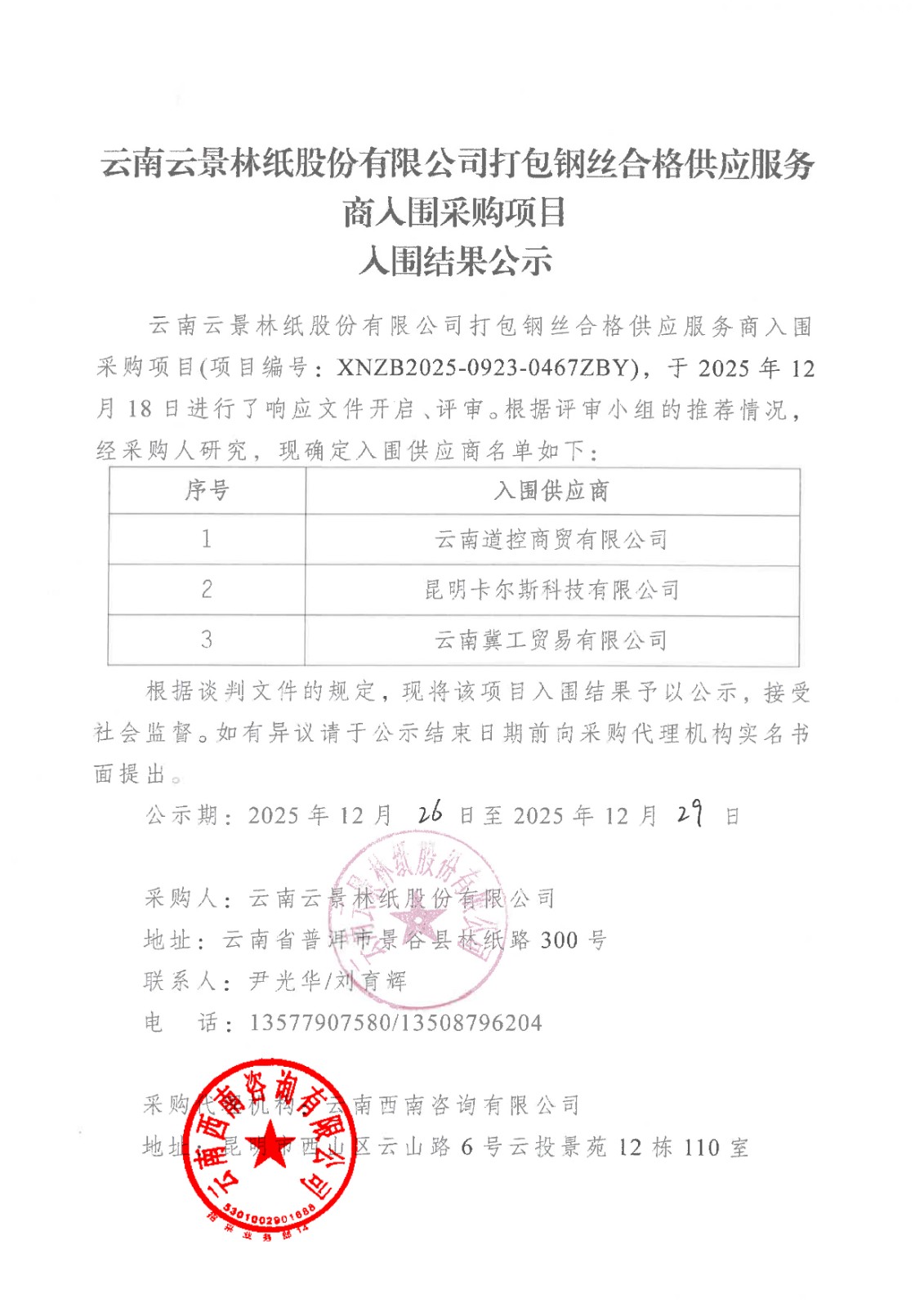 云南云景林紙股份有限公司打包鋼絲合格供應(yīng)服務(wù)商人圍采購項目入圍結(jié)果公示