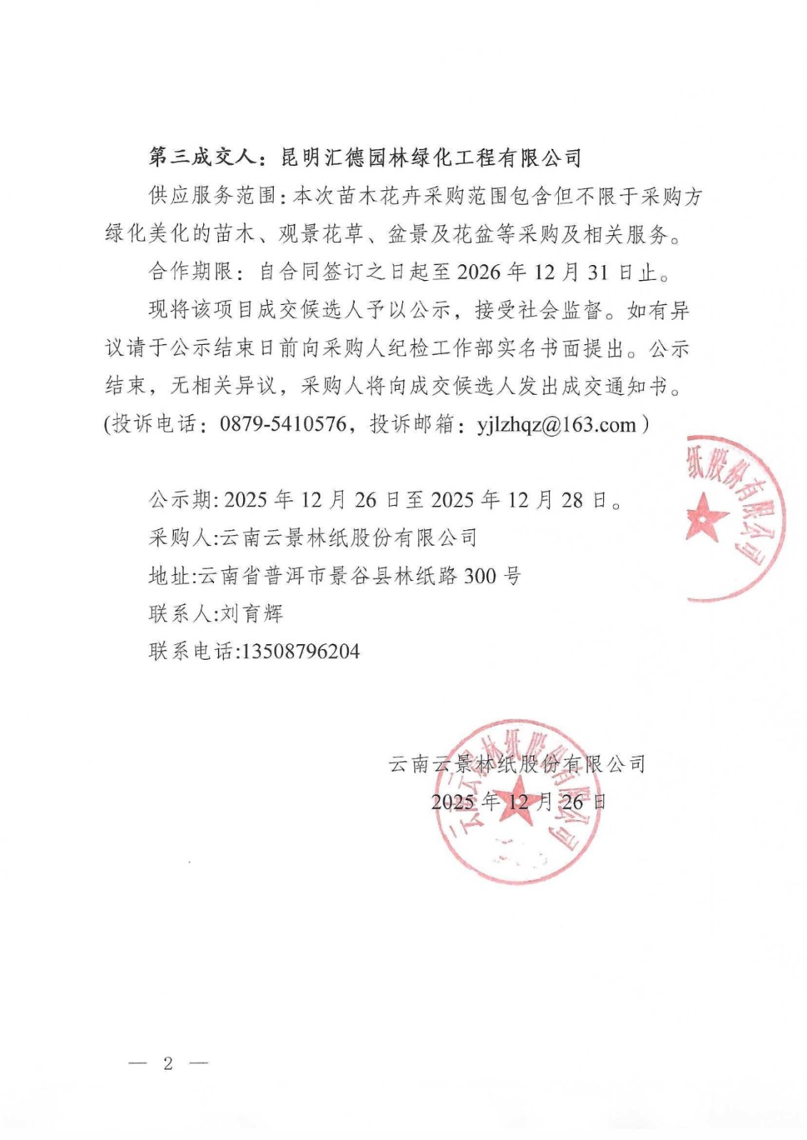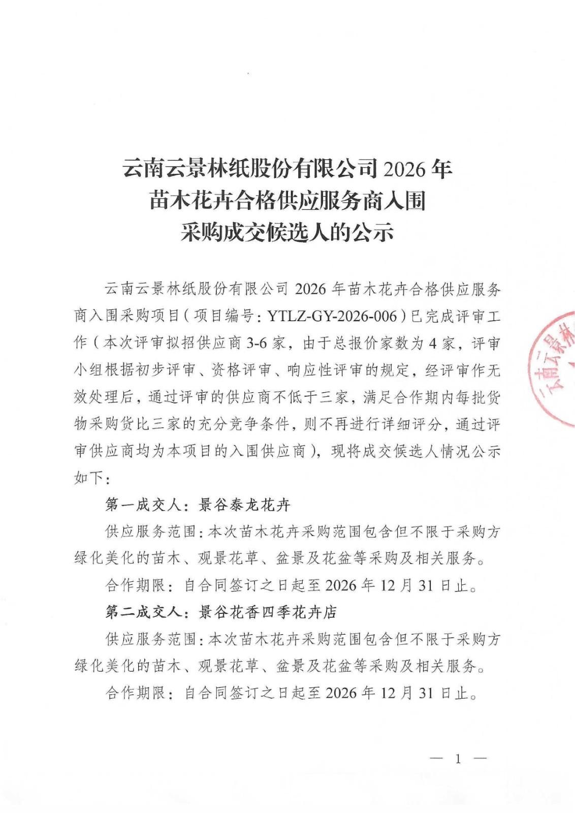 云南云景林紙股份有限公司2026年苗木花卉合格供應(yīng)服務(wù)商入圍采購成交候選人的公示
