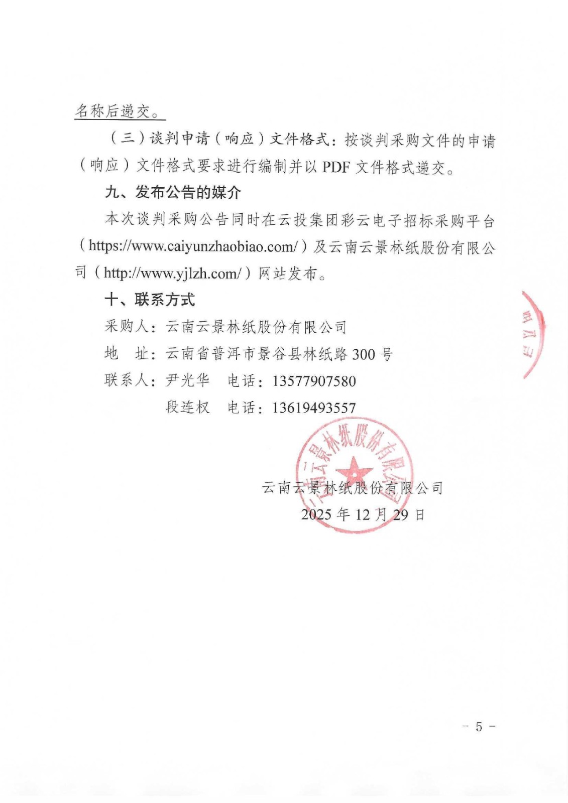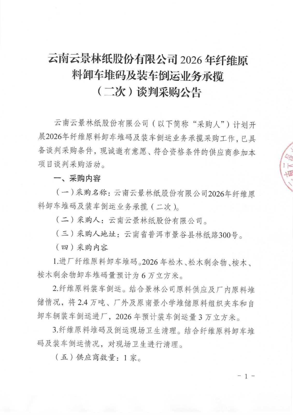 云南云景林紙股份有限公司2026年纖維原料卸車堆碼及裝車倒運業(yè)務(wù)承攬(二次)談判采購公告
