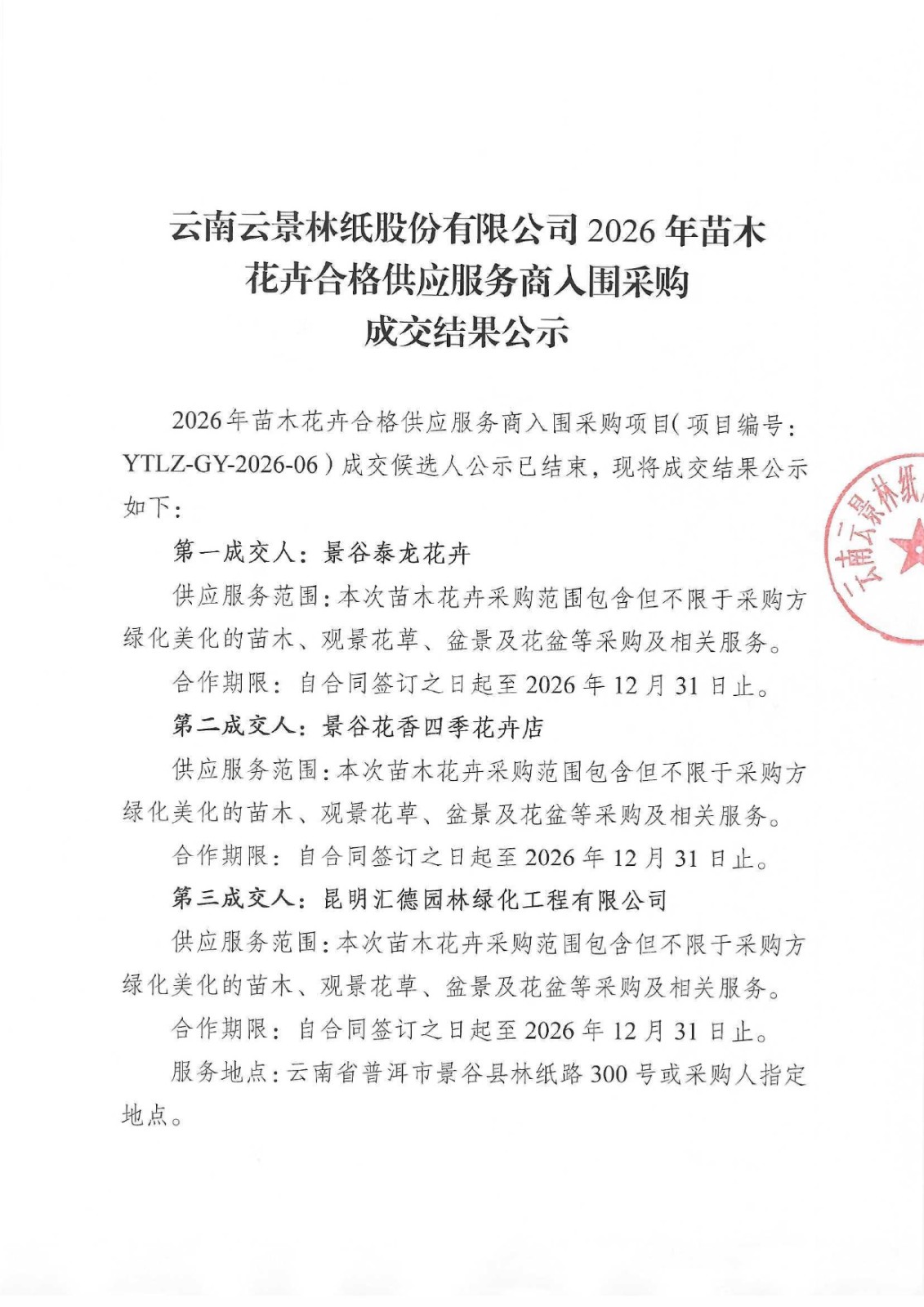 云南云景林紙股份有限公司2026年苗木花卉合格供應(yīng)服務(wù)商人圍采購成交結(jié)果公示