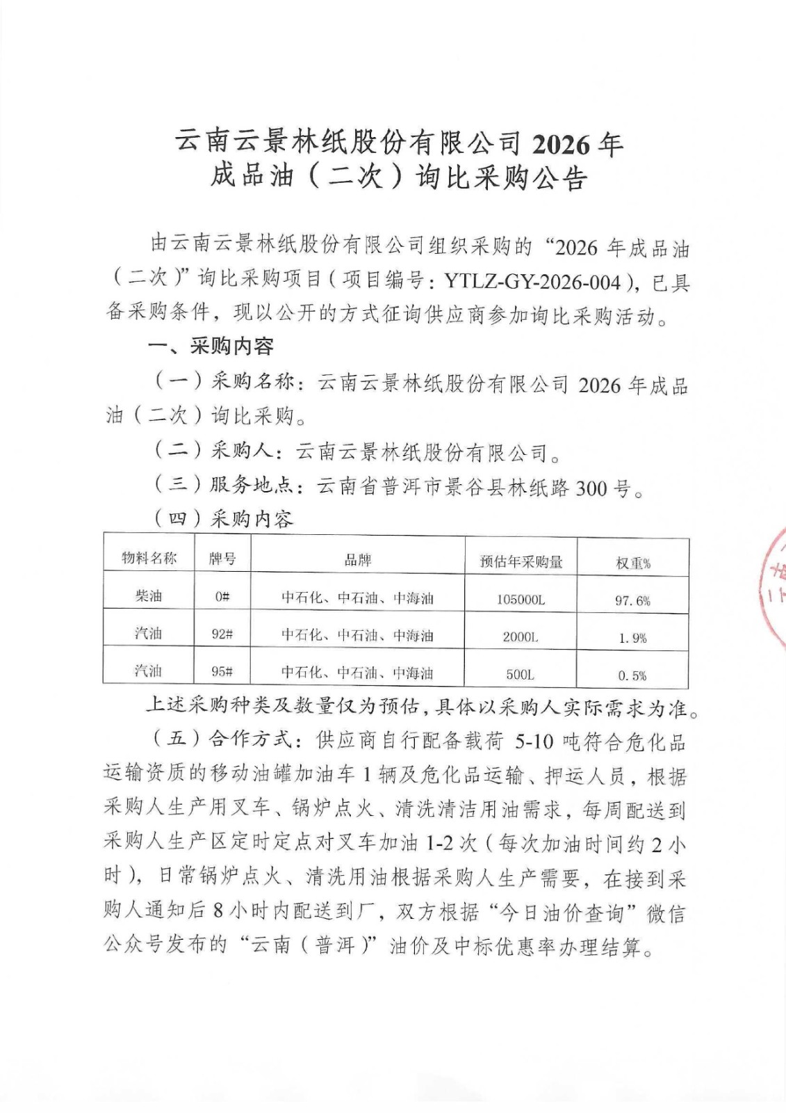 云南云景林紙股份有限公司2026年成品油(二次)詢比采購公告
