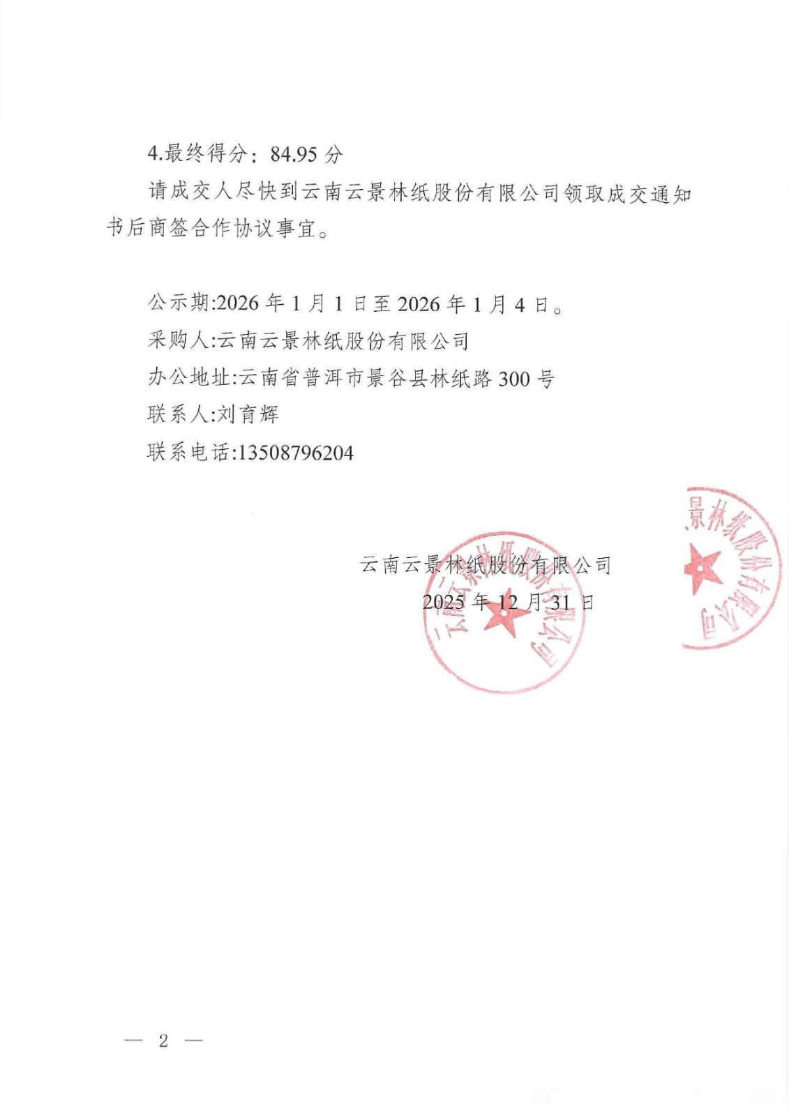 云南云景林紙股份有限公司2026 年電力市場化交易代理服務(wù)成交公示