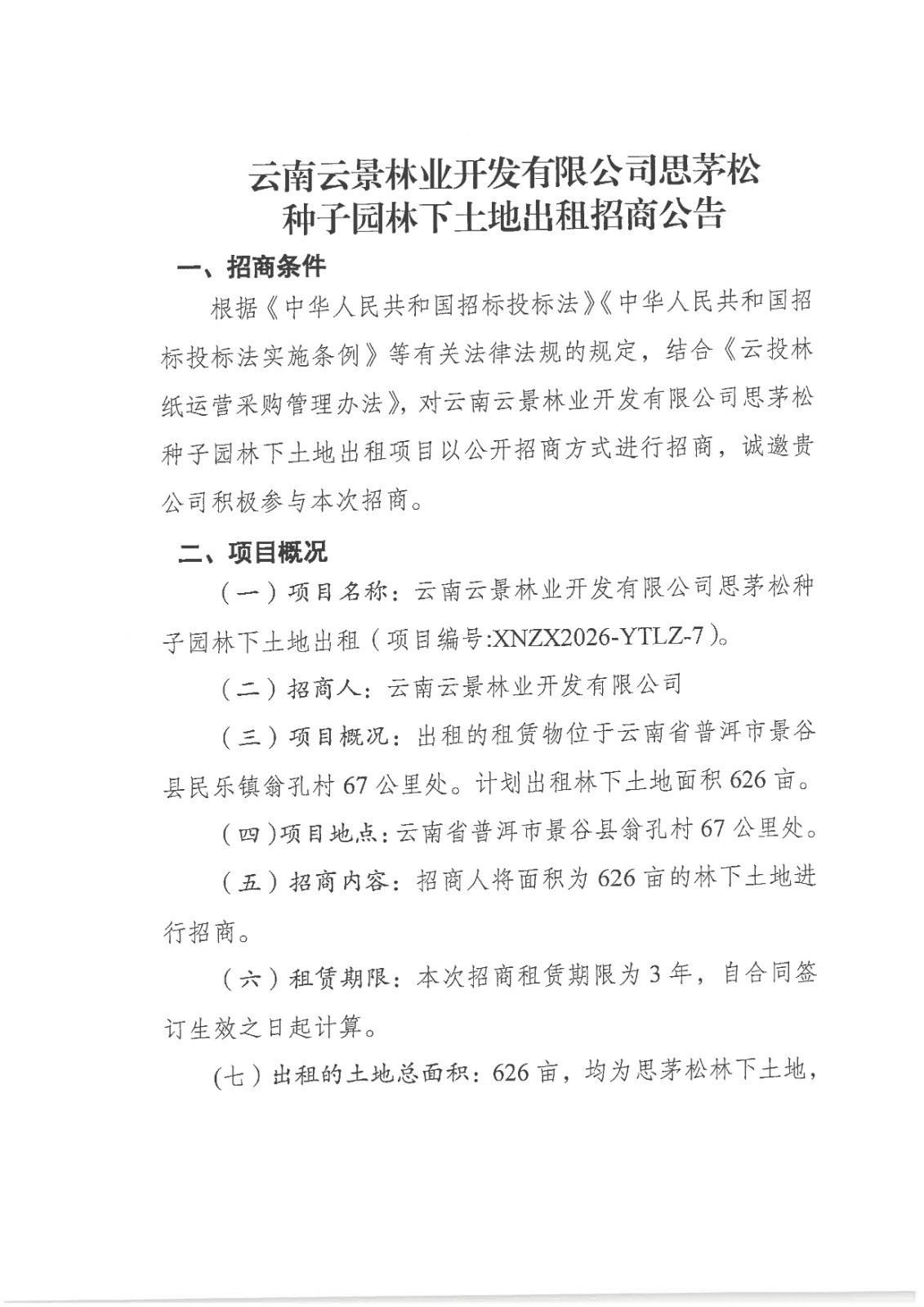 云南云景林業(yè)開(kāi)發(fā)有限公司思茅松種子園林下土地出租招商公告